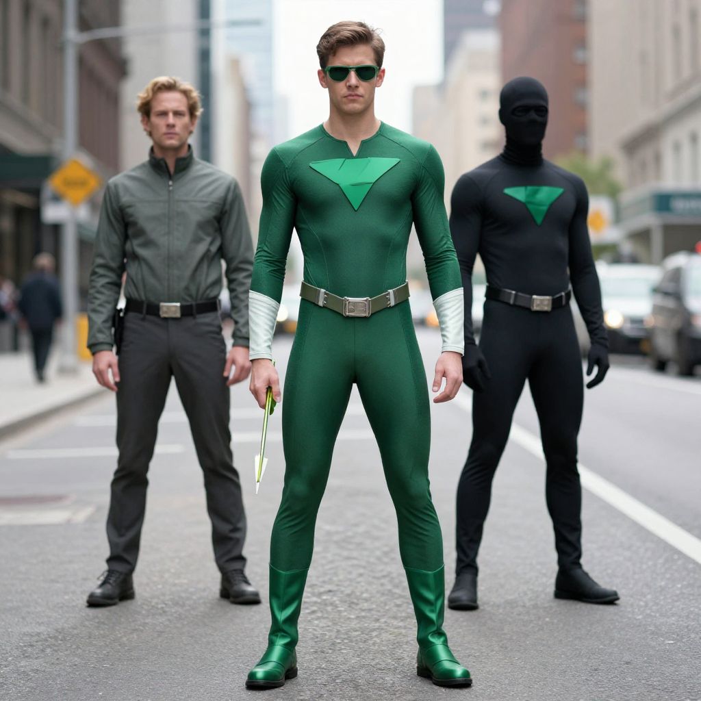 Green Arrow Suits, arrow in green costume standing in the middle of a city street