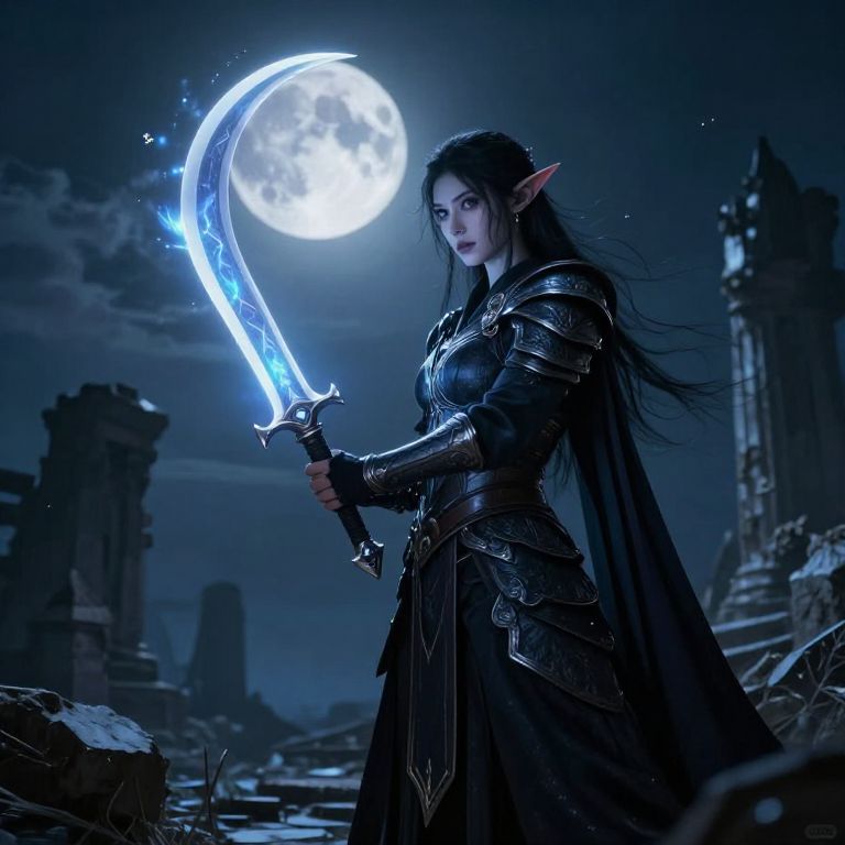 Moon elf art illustrating a mysterious moon elf warrior wielding a glowing crescent blade, standing amidst ruins under an ethereal moonlit sky, dramatic lighting emphasizing the magical atmosphere and ancient mystical elements.