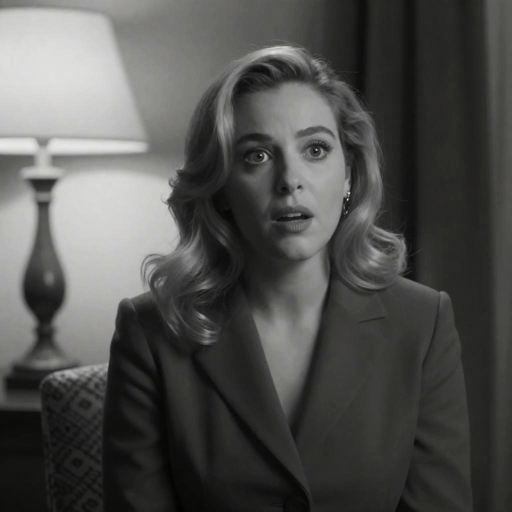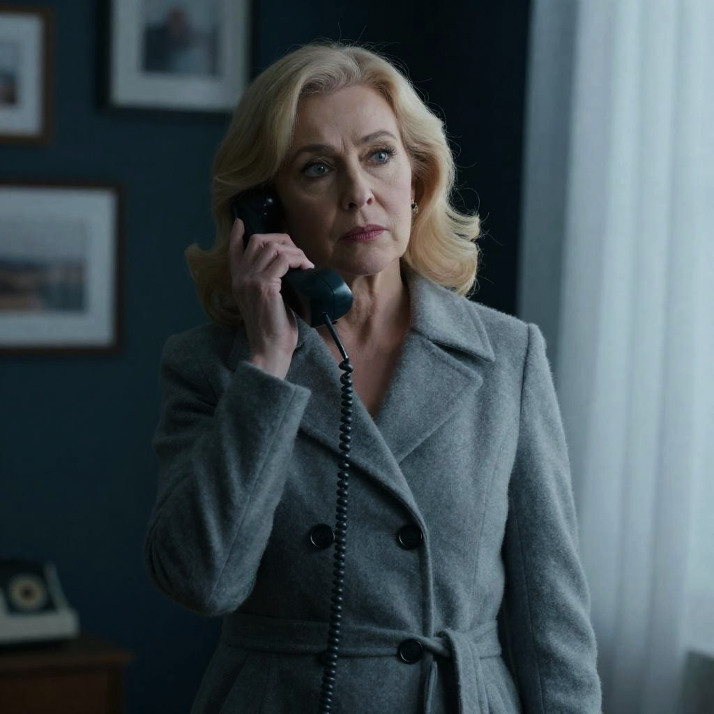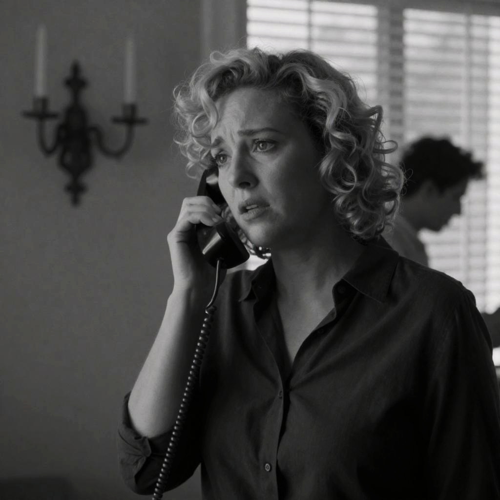 Black-and-white photograph of a woman with curly blonde hair, wearing a dark shirt, holding a vintage black phone to her ear. She looks concerned. Background: window with blinds, another person visible outside. Wall sconce with two candles on the left. Woman in foreground slightly to the left, person outside slightly to the right.