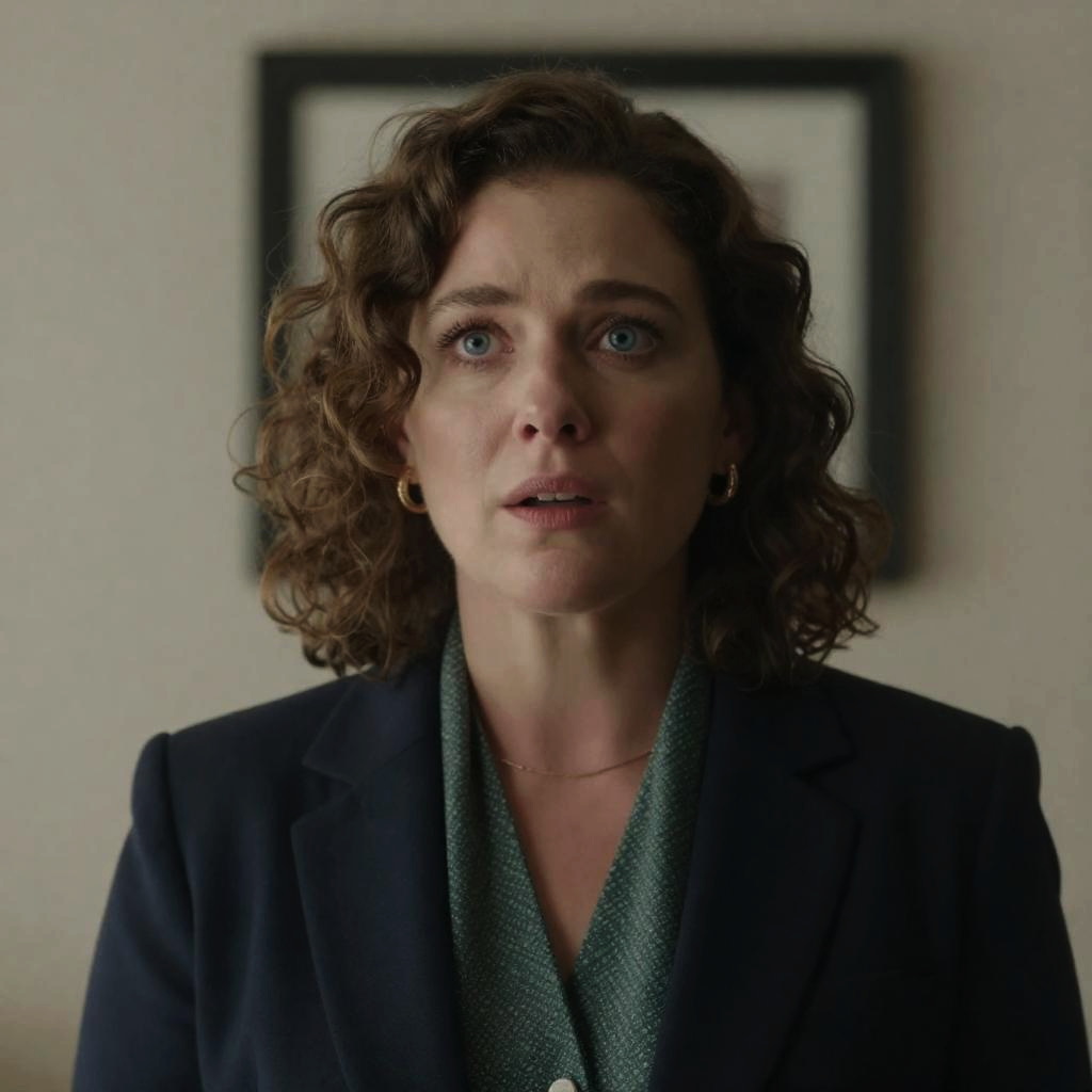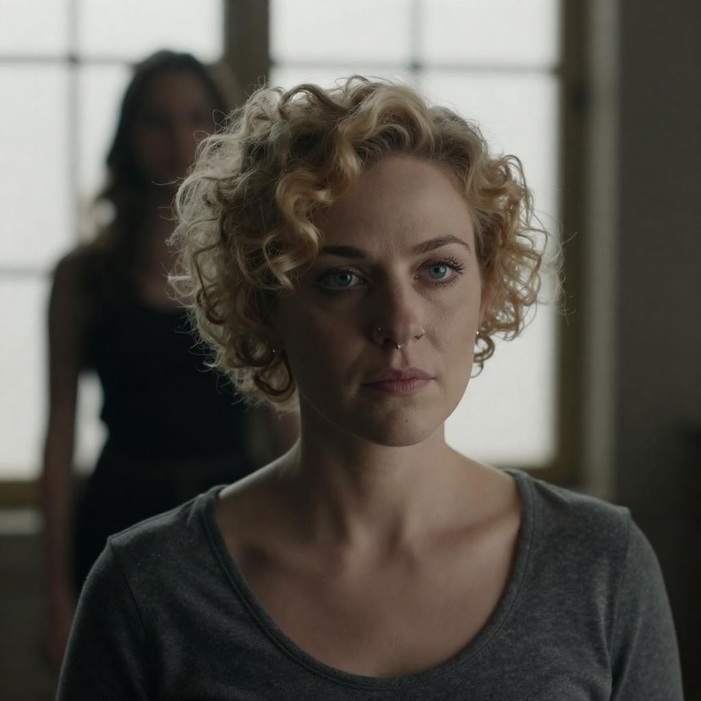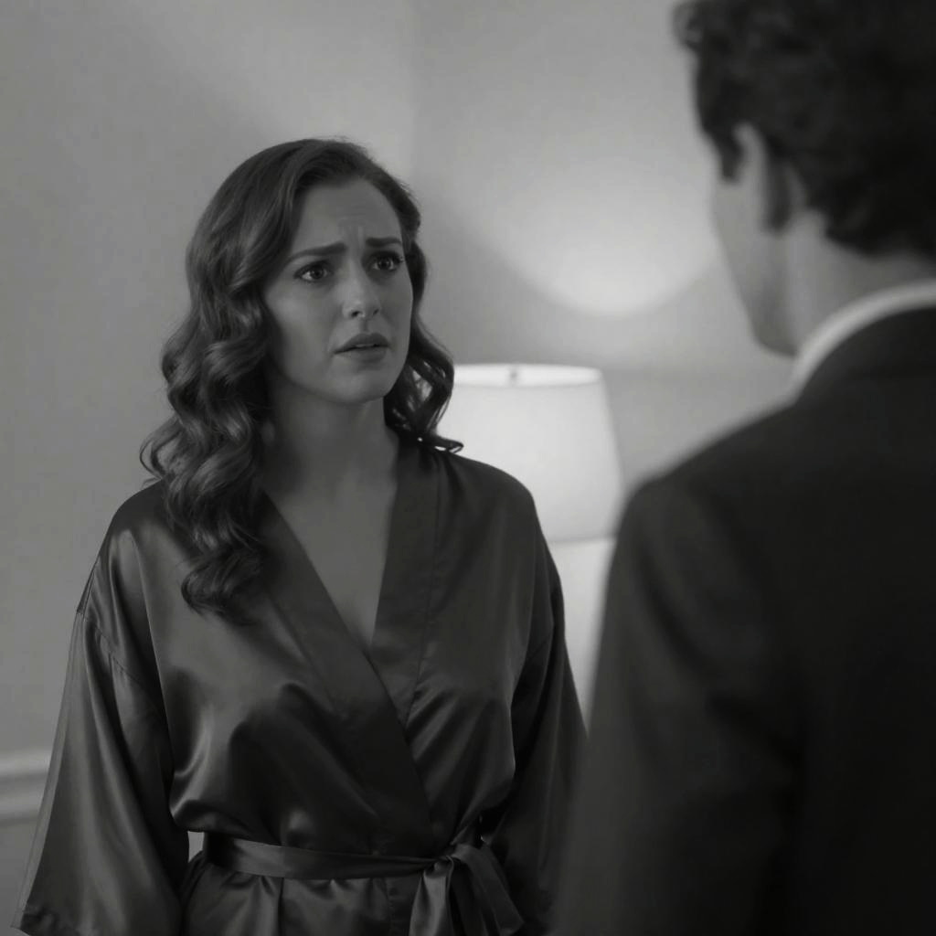 Black-and-white photograph of a woman with curly blonde hair, wearing a dark shirt, holding a vintage black phone to her ear. She looks concerned. Background: window with blinds, another person visible outside. Wall sconce with two candles on the left. Woman in foreground slightly to the left, person outside slightly to the right.