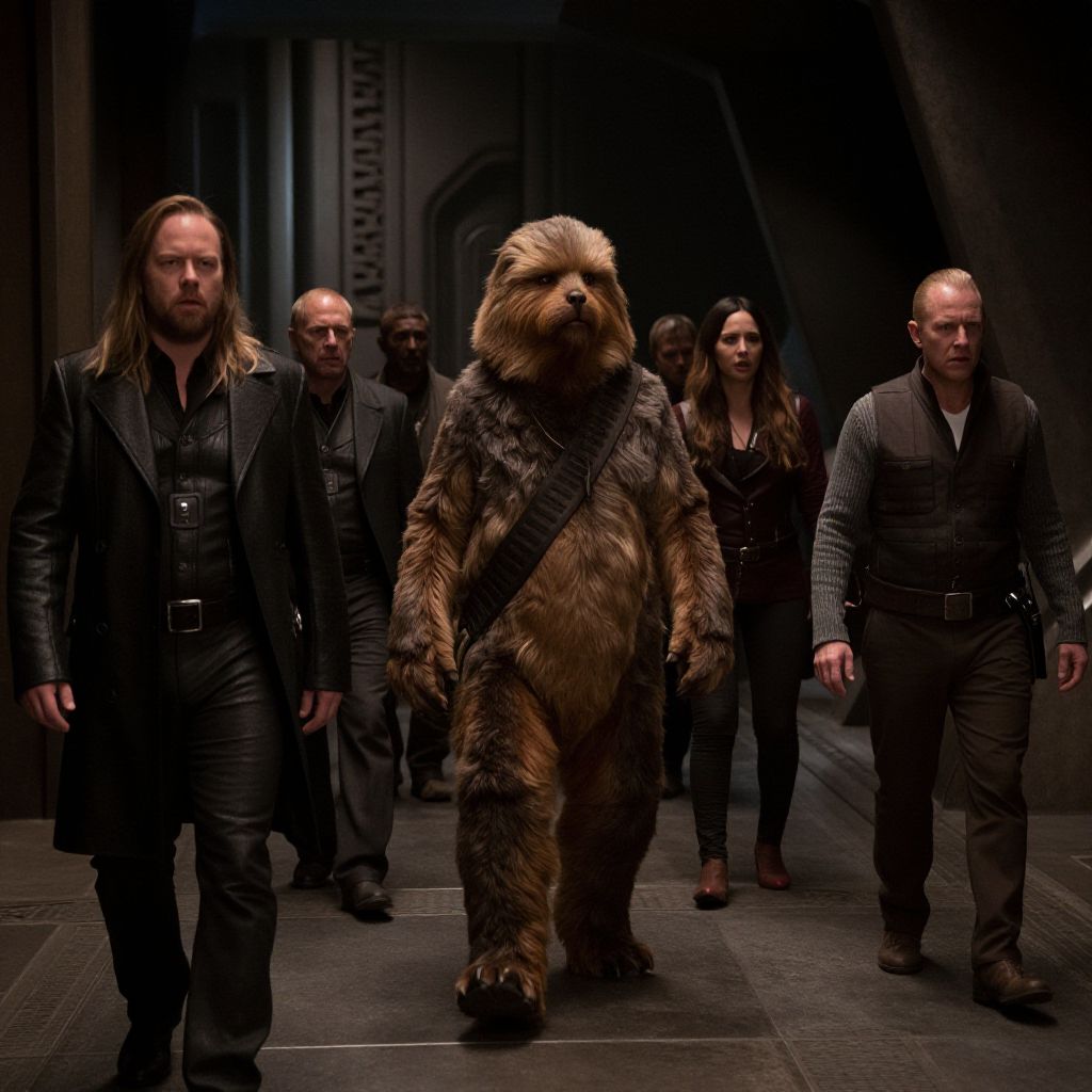 Photograph of a dark, futuristic stage with six people walking in a line. At the center is Chewbacca, a tall, furry Wookiee with brown and tan fur, wearing a diagonal black strap across his chest. To his left is a man with long, straight brown hair, a beard, and a black leather jacket over a dark shirt. Behind him are three men and one woman, all dressed in black, utilitarian attire. The woman has long brown hair and a black top. The background is dimly lit with industrial, metallic textures. The image has a dramatic, sci-fi feel, reminiscent of the Star Wars franchise.