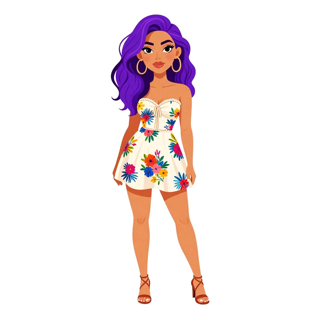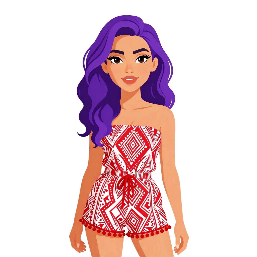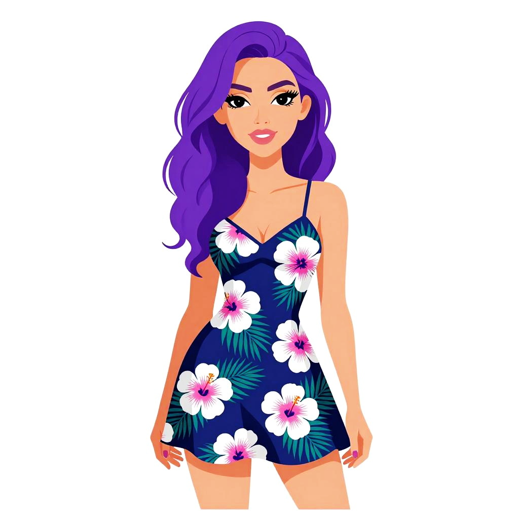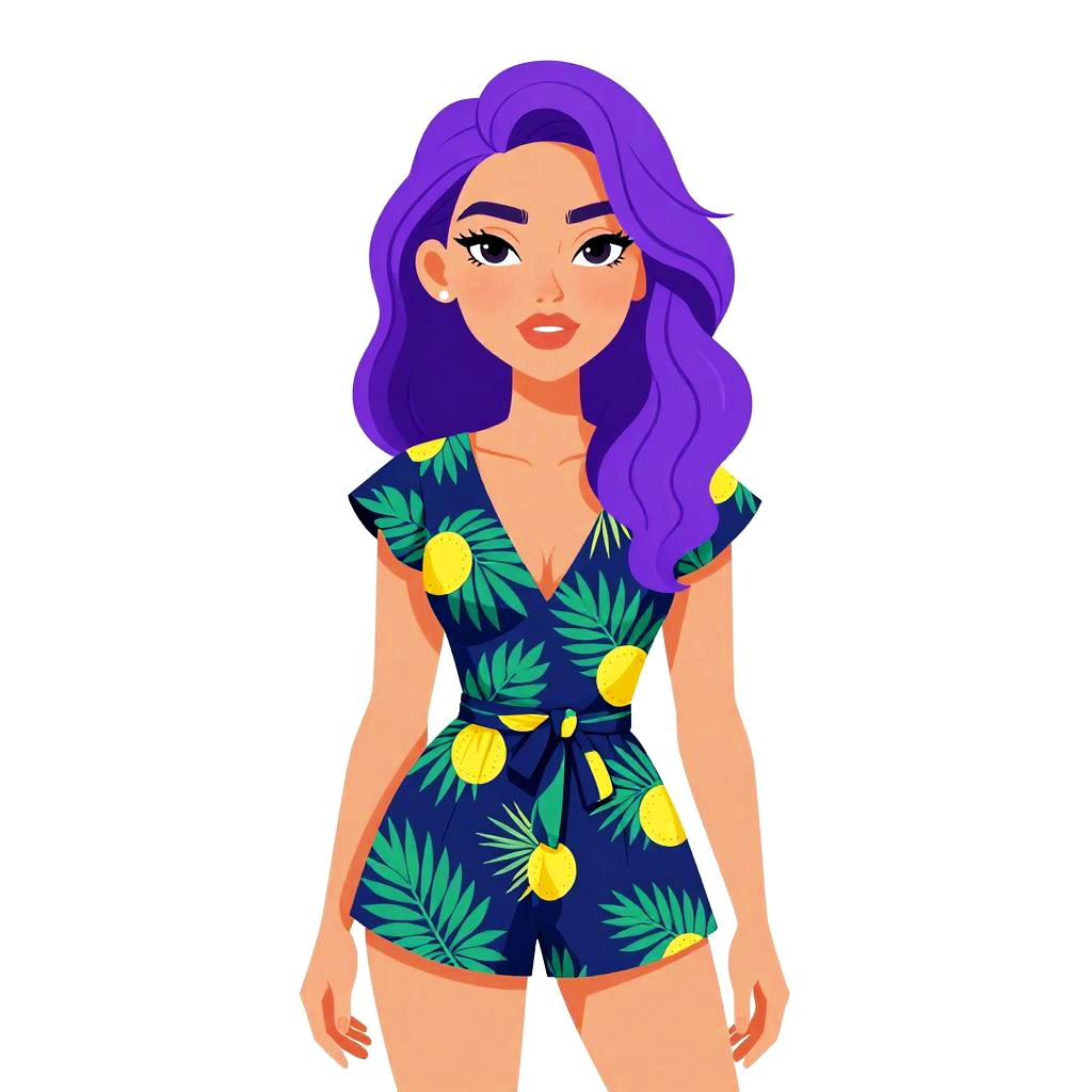 Woman with pretty face and pretty hair. Woman, tropical print, short V-neck playsuit in dark blue with green palm leaf and yellow fruit motifs, short flutter sleeves, cinched waist with tie belt, pleated shorts, studio background with white backdrop. --sref 1467