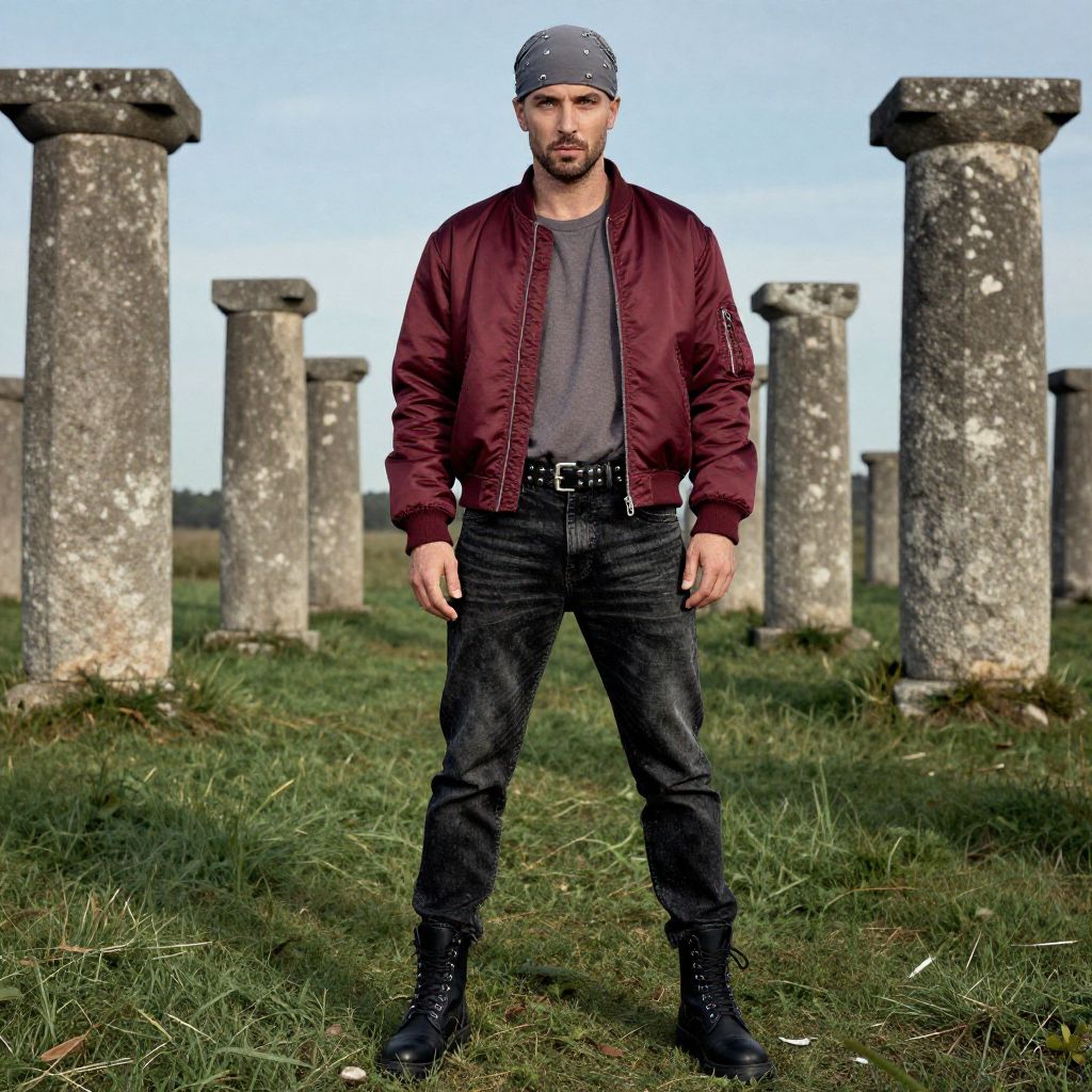 A man, burgundy bomber jacket, acid-wash black jeans, grey bandana, slim studded belt, chunky lace-up boots, oversized band tee, ancient stone pillars, lush green grass, clear blue sky, hand-tinted photograph, confident expression. Man has masculine face and piercing eyes