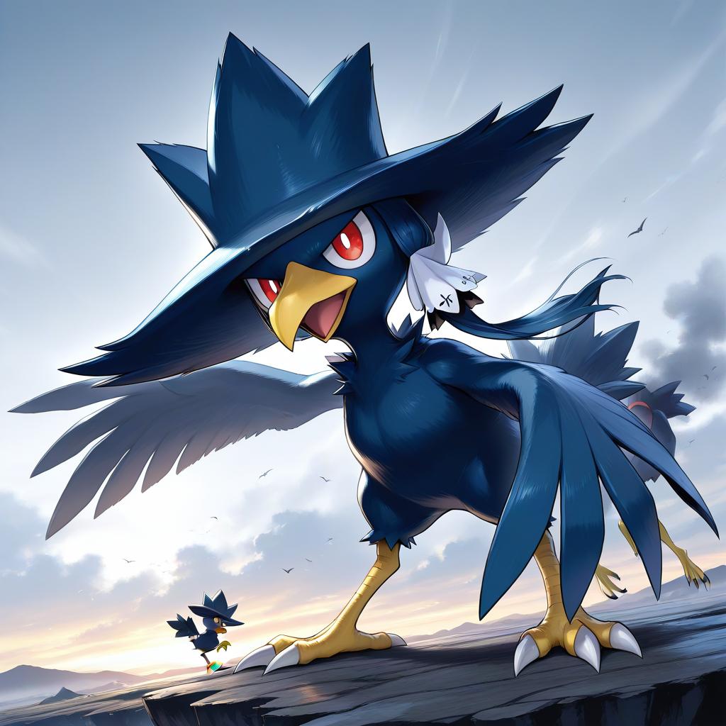 Digital artwork of a stylized, anthropomorphic bird with dark blue feathers and a large, pointed black hat. The bird has bright red eyes, a yellow beak, and sharp claws. Its wings are spread wide, revealing white feathers on its chest. The background showcases a dramatic sky with bright sunlight and soft clouds. The bird stands on a rocky surface, with a smaller, similarly styled bird flying nearby. The overall style is vibrant and dynamic, with strong contrasts and a slightly exaggerated, cartoonish appearance.
