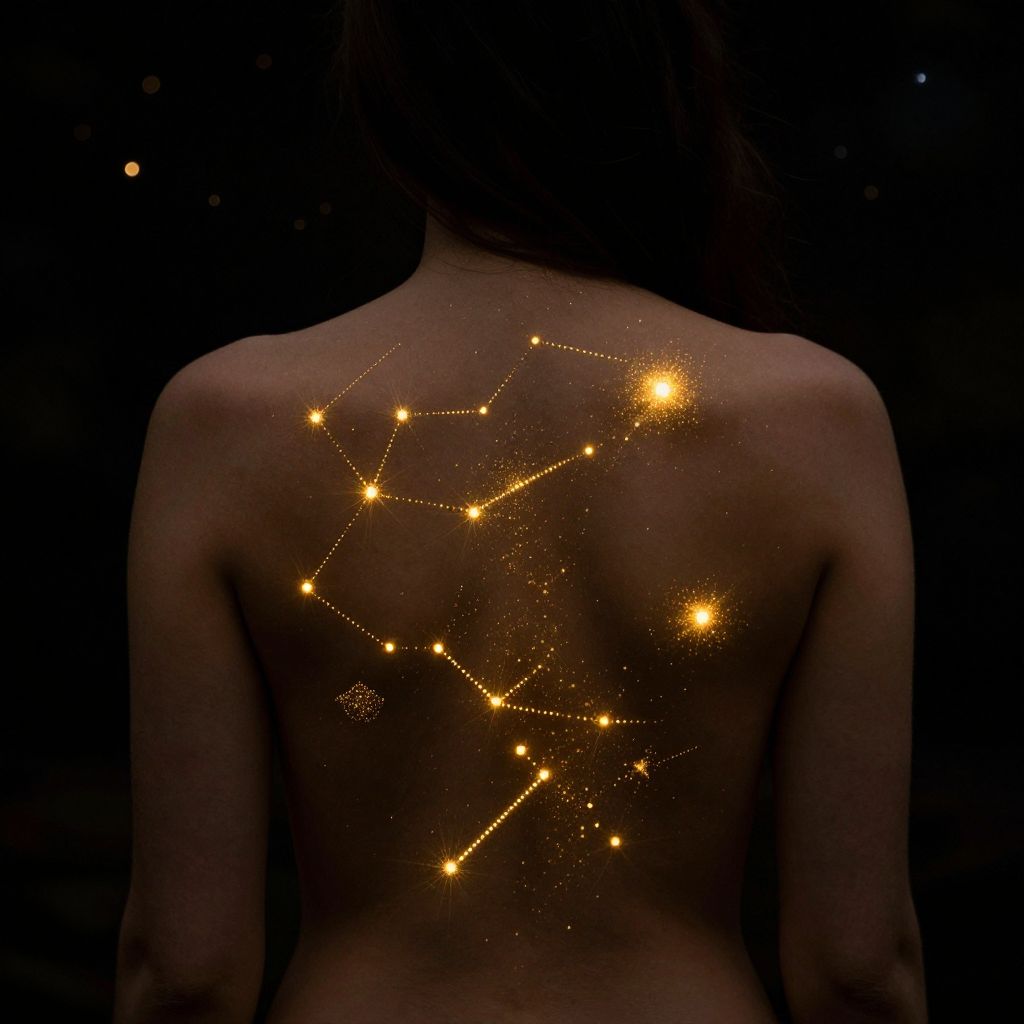 Photograph of a bare-backed person with glowing constellation map on their back, set against a dark, starry background.