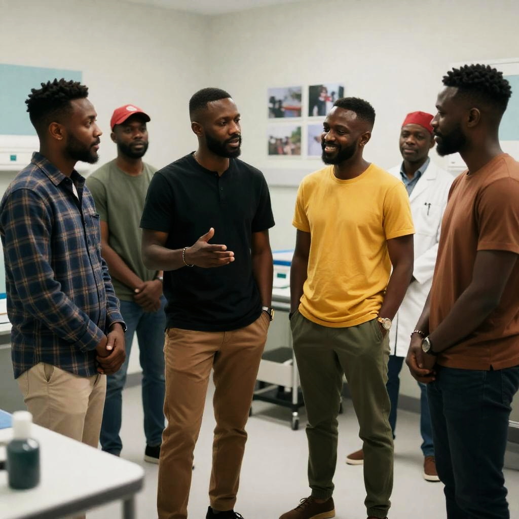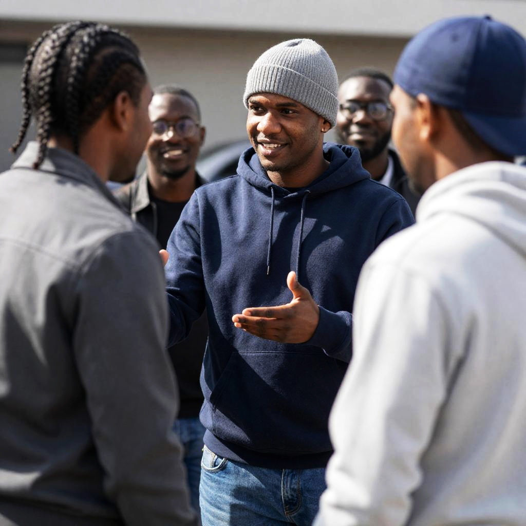 Photograph of a group of men outdoors. Central figure in a gray beanie and navy hoodie gestures to a man with braided hair in a gray jacket. Smiling men in the background, one with glasses. One man in blue headwrap with back to camera. Casual clothing, sunny day, urban setting.