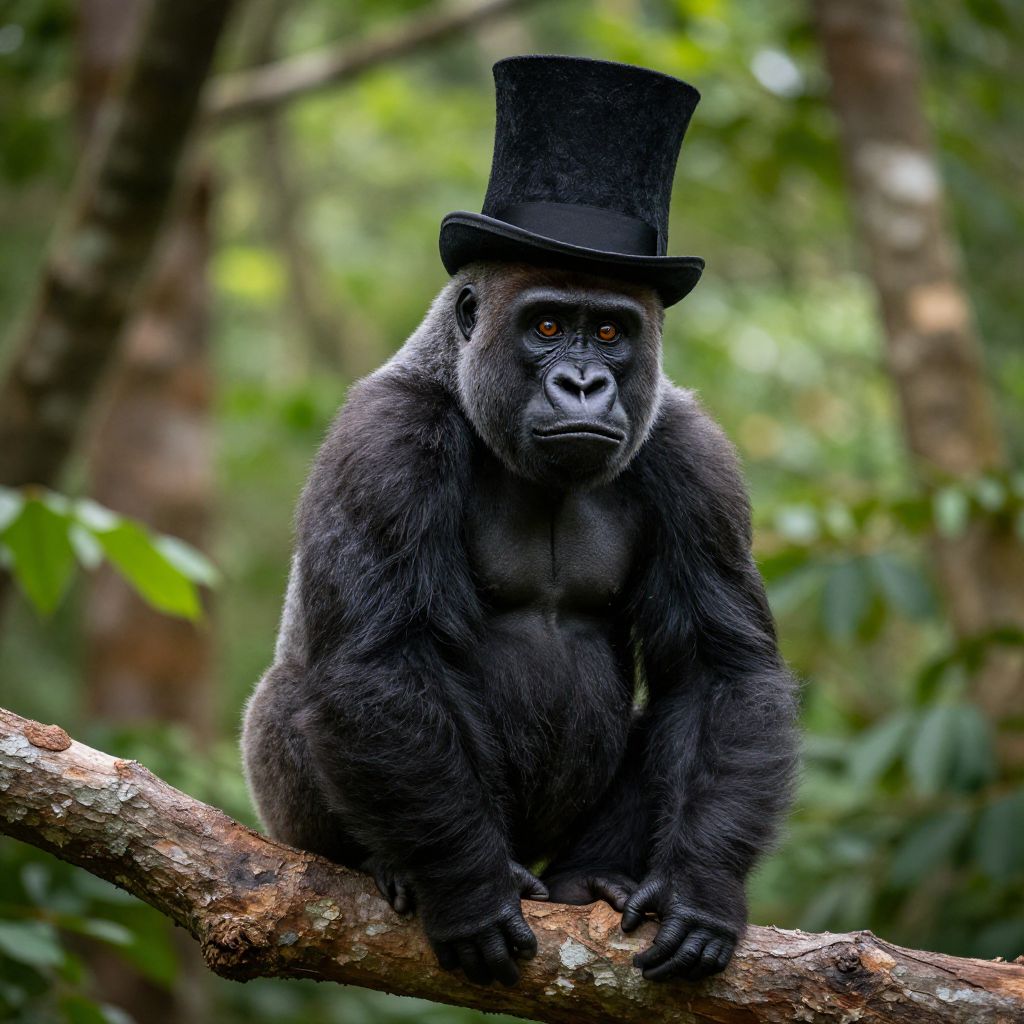 Digital CGI image depicting a muscular, black-furred gorilla with a stern expression, wearing a tall, black top hat. The gorilla's broad chest and defined muscles are prominent. The background is a lush, dense jungle with vibrant green foliage, illuminated by colorful, glowing lights in the distance. The image has a surreal, fantastical feel, blending realistic animal features with whimsical elements. The lighting emphasizes the gorilla's fur texture and the jungle's depth. The overall style is hyper-realistic with a touch of fantasy.