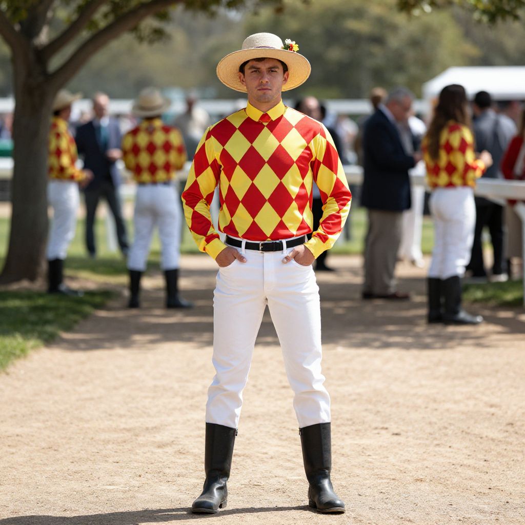 Photograph of a man standing on a sunlit dirt path at a horse racing event. He's wearing a red and yellow diamond-patterned shirt, white pants, black boots, and a wide-brimmed hat with a small flower. His hands are in his pockets, and he's looking directly at the camera. The background is blurred but shows people in similar attire and trees. The image has a vibrant, slightly surreal quality.