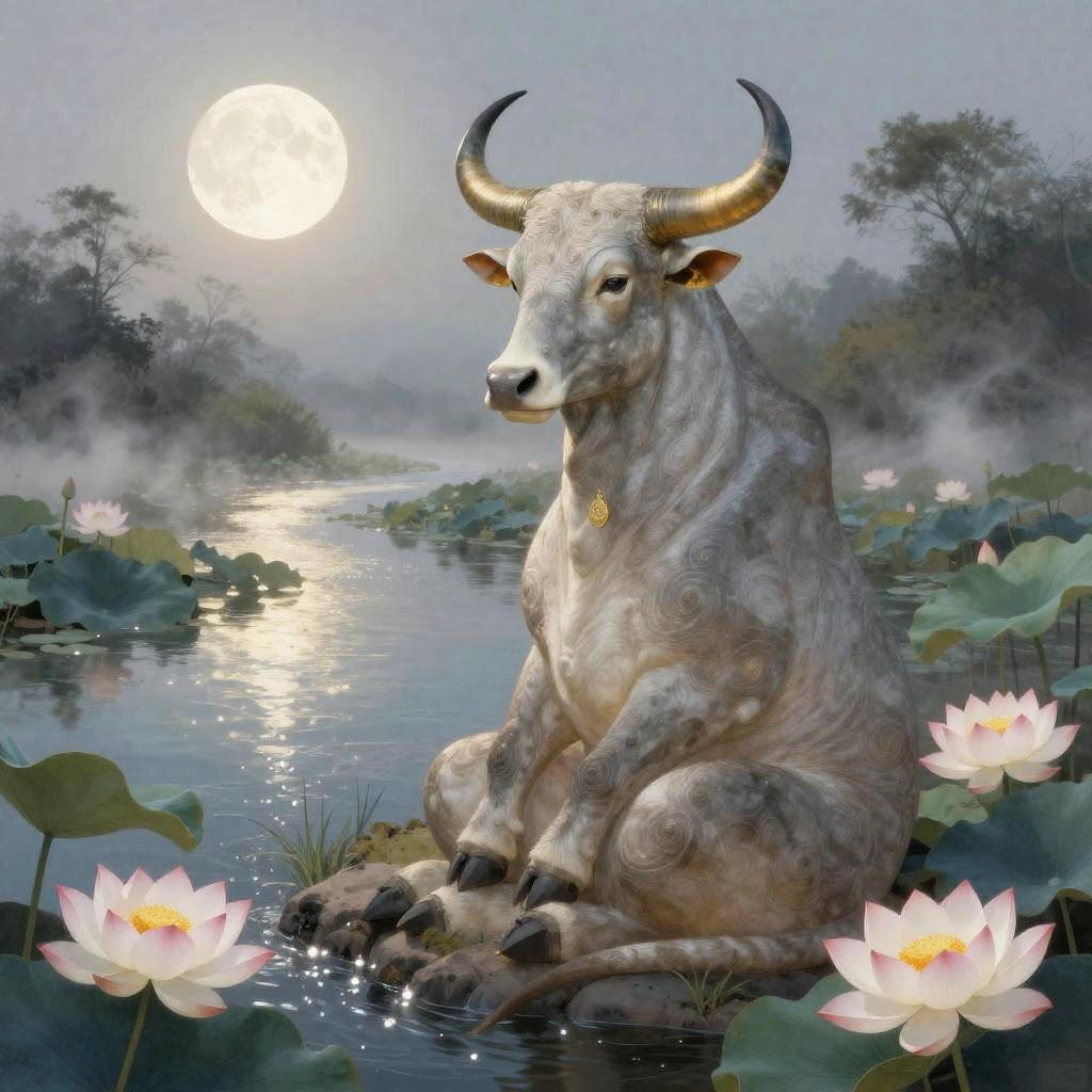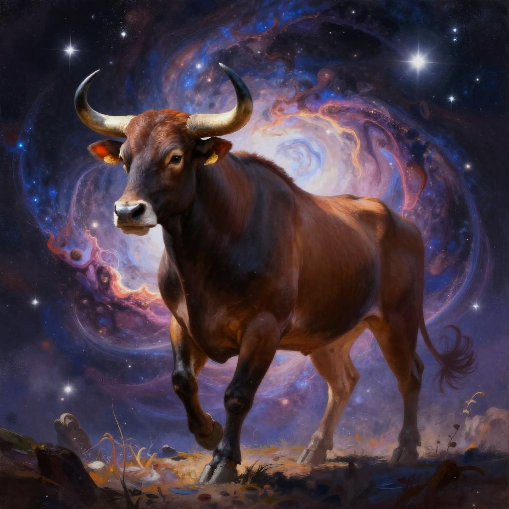 Taurus spirit animal, a majestic bull with glowing eyes standing amidst a lush, mystical forest at dawn, ethereal light filtering through ancient trees, highly detailed and vibrant colors, fantasy art style