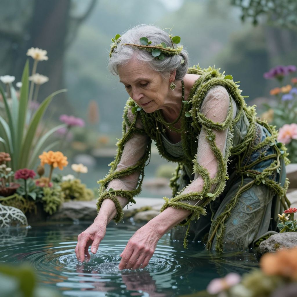 An elderly woman adorned in avant-garde attire crafted from living vines gently dips her hands into a tranquil pond, surrounded by vibrant flora and bathed in the soft, ethereal light of a serene natural setting, evoking a dreamlike, cyberpunk-inspired fusion of nature and technology.