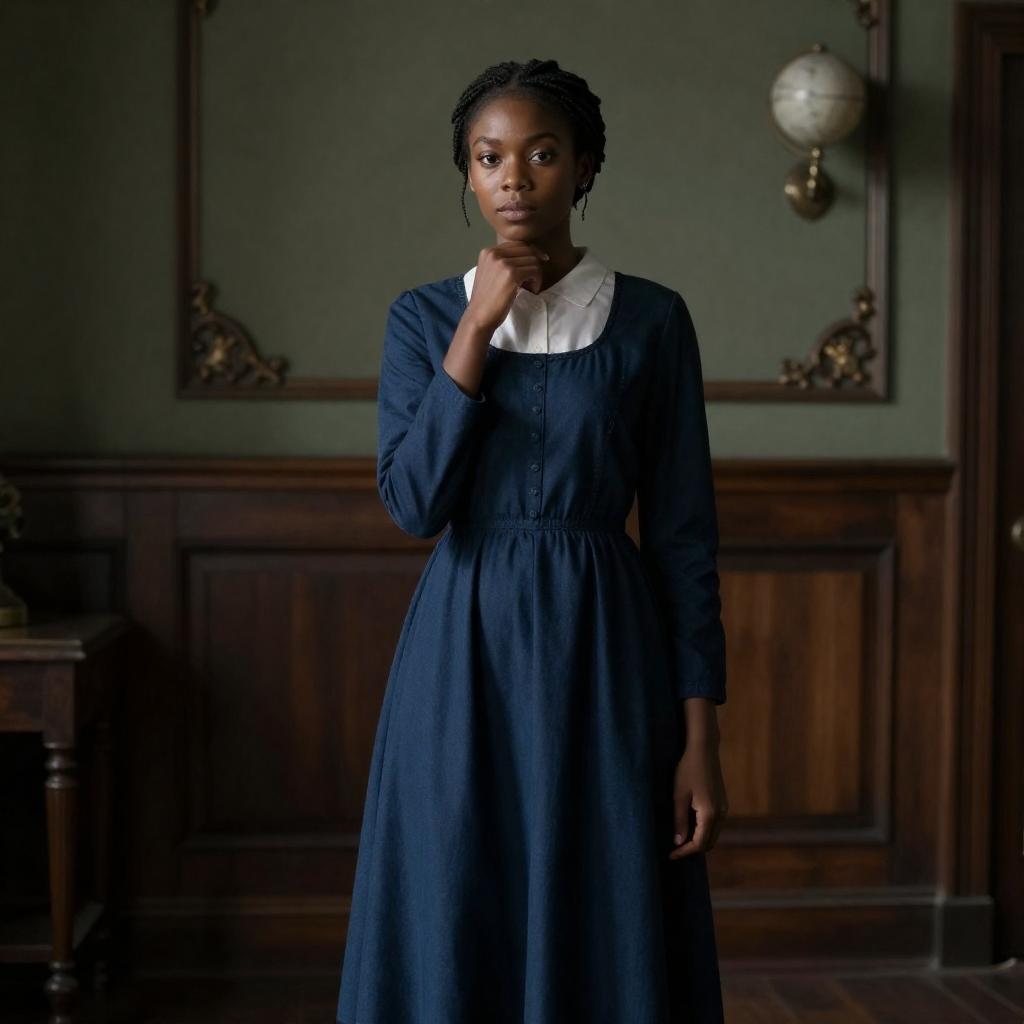 Photograph of a young Black woman with medium brown skin and a slender build, wearing a dark blue t-shirt and white gloves, standing with hands on hips. She has her hair in a bun, adorned with a black headband. Background features an old, white, two-story house with a green roof and a white porch. Greenery and yellow flowers are in the foreground.