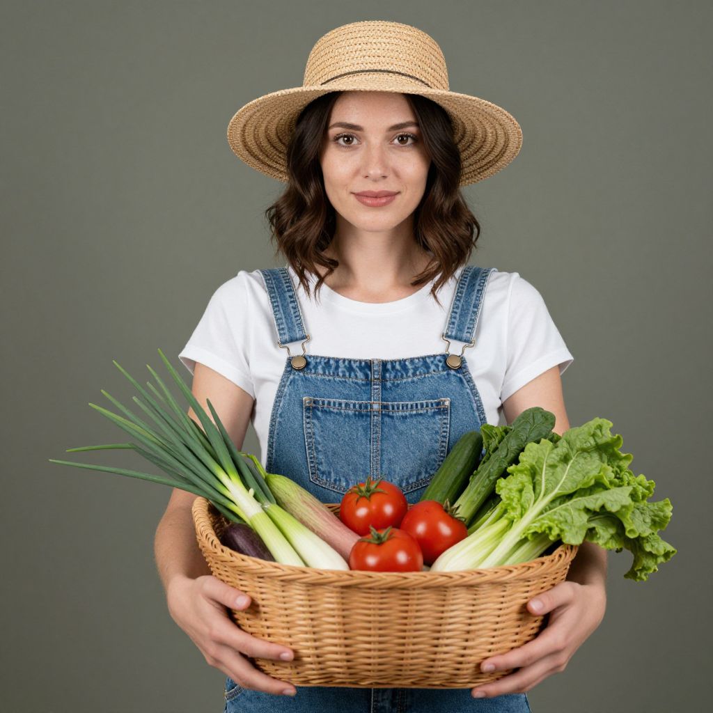 Woman wearing a straw hat and denim overalls holds a woven basket filled with fresh vegetables, including green onions, tomatoes, and leafy greens, against a muted background.