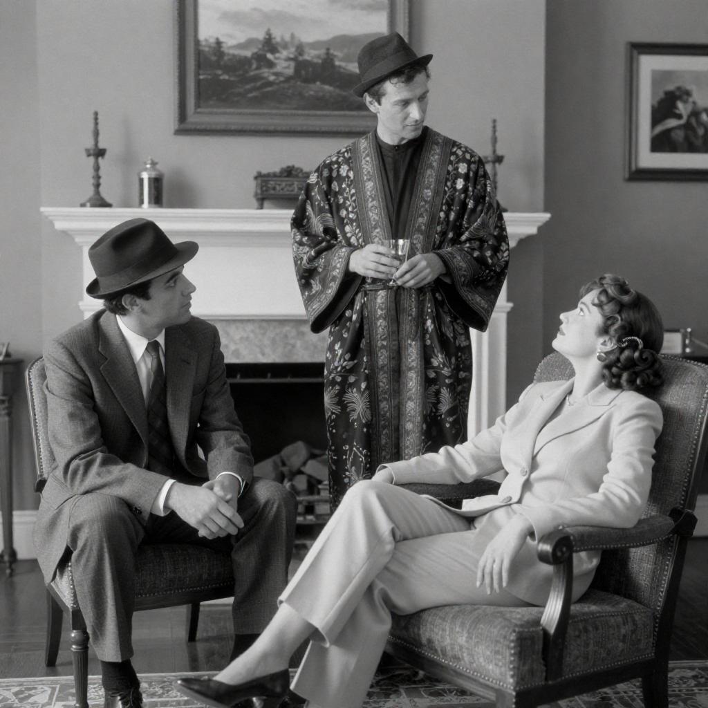 Black and white photograph of three people in a living room. Man in suit and fedora sits, man in patterned robe stands holding a glass, woman in light suit reclines on chair. Fireplace in background. Reclining woman looks up at standing man. Sitting man looks at standing man.