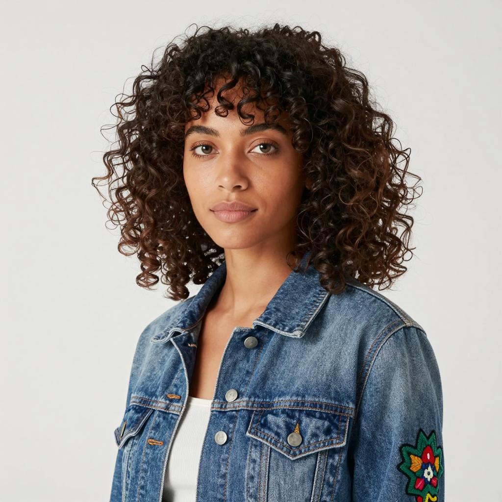 A woman with curly dark hair, wearing dark lipstick and a sheer, patterned top. She has a diamond-shaped earring in her left ear. Her gaze is slightly downward and to the left. Her right shoulder is visible in the foreground.