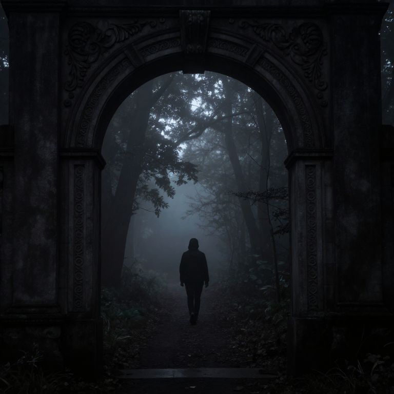 Mysterious archway frames a solitary figure walking through a foggy forest, its ornate design contrasting sharply against the eerie, pitch-black surroundings as light filters faintly through the trees ahead.