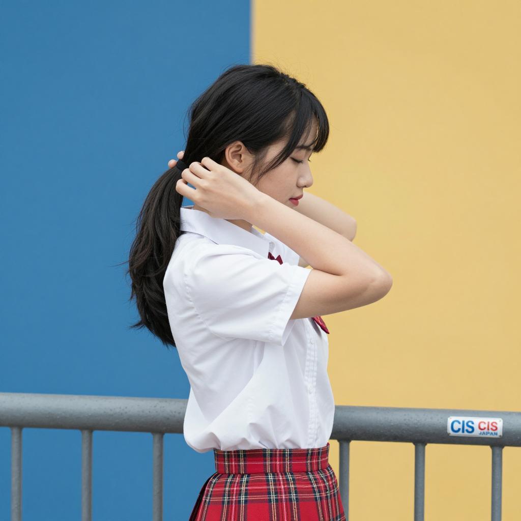 Young Asian woman with long dark hair wearing a white shirt and black tie drinks water from a concrete outdoor water fountain. She leans over the metal spout, cupping water in her hands as the clear water splashes into the basin below. The background includes blurred greenery and part of a building, indicating an outdoor urban or campus setting.