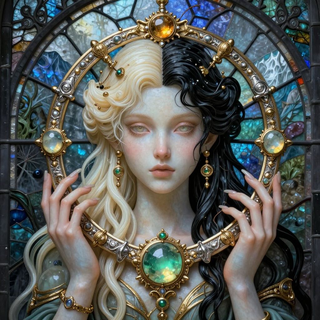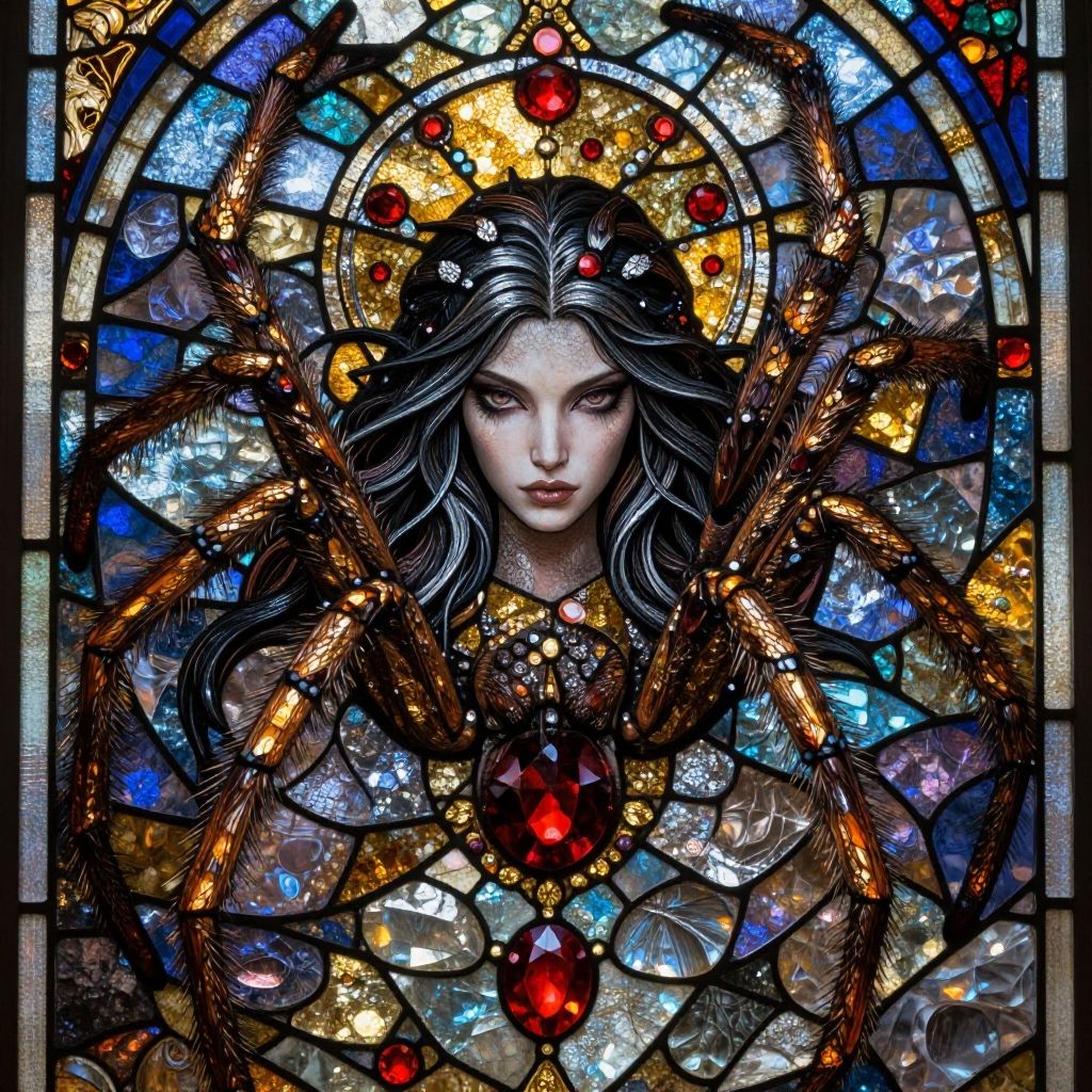 . and ebony and gold and silver and . and . and ruby and . and topaz ornament of Jorogumo - Mythological creature from Japanese folklore, often depicted as a spider that can transform into a beautiful woman to seduce men. Deborah Azzopardi, natural, shimmering, vibrant, gothic, rpg, 1400ad, ultra detailed, detailed, immersive, reminiscent of high fantasy RPG games, HD, masterpiece, best quality, hyper detailed, super realistic, perfect face, perfect hands, award-winning, professional, breathtaking, linquiveradreary Glacierhorrible weatherstained glass style . vibrant, beautiful, translucent, intricate