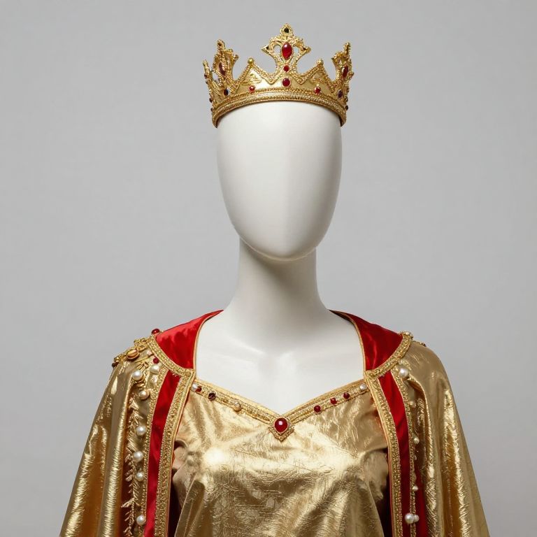Mannequin wearing a gold and red outfit with a gold crown on his head.