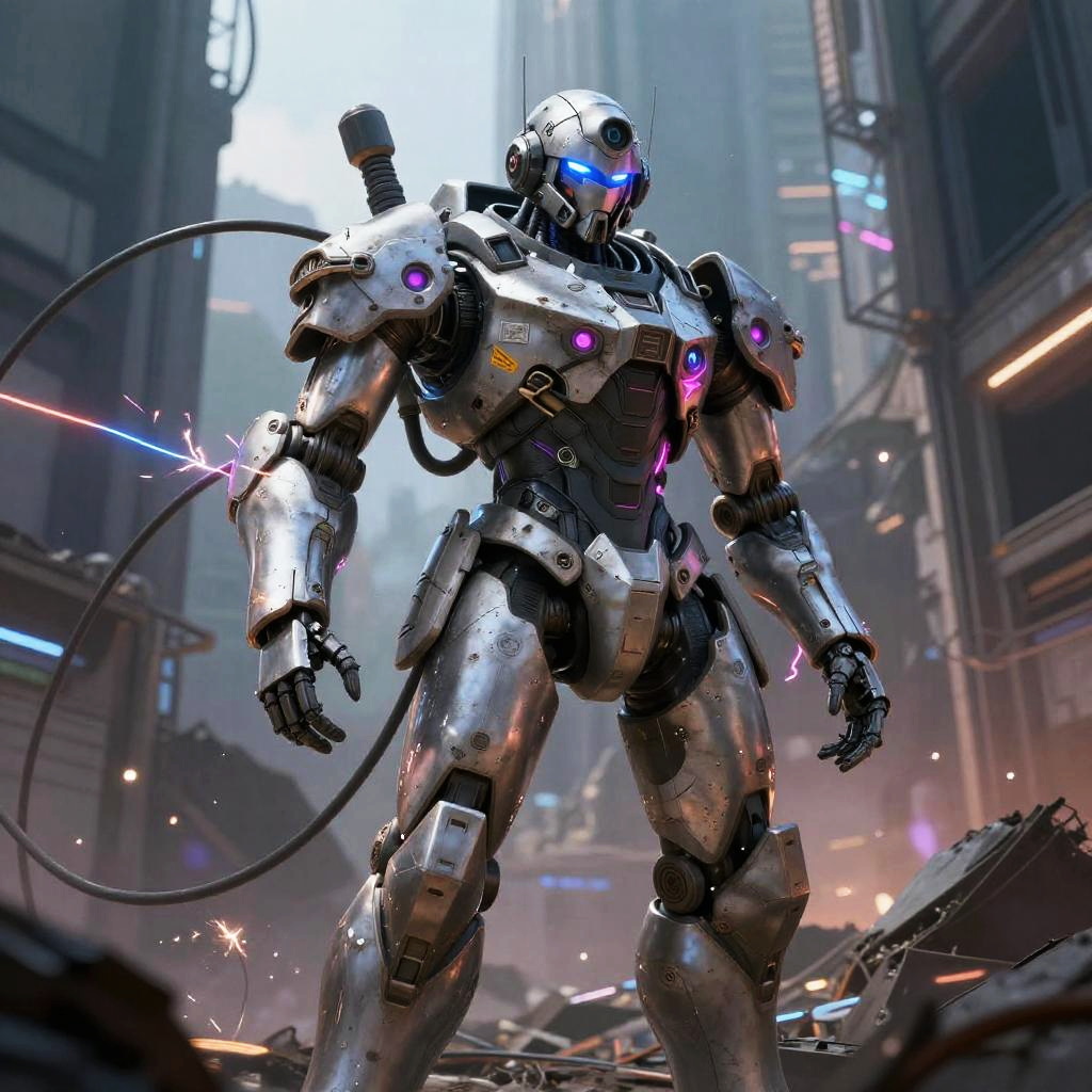 A rogue mech pilot, with battle-worn armor with neon highlights, surrounded by sparking electric cables, in the ruins of a post-apocalyptic metropolis, depicted in the genre-blending and ethereal style of Yoko Kanno.