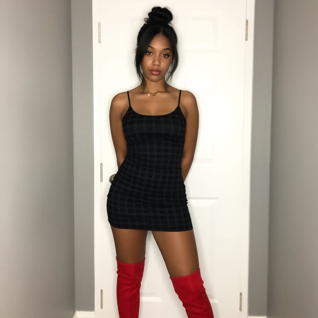 Photograph of a Black woman with dark skin, black hair in a bun, wearing a black checkered mini dress and red thigh-high boots, standing