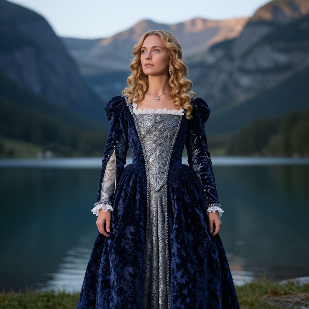 A woman with curly blonde hair is dressed in a luxurious, deep blue Renaissance-style velvet gown with intricate silver lace details, standing by a serene lake surrounded by towering mountains. The soft evening light highlights her contemplative expression and the elegant texture of her costume, blending historical fashion with a natural alpine backdrop.