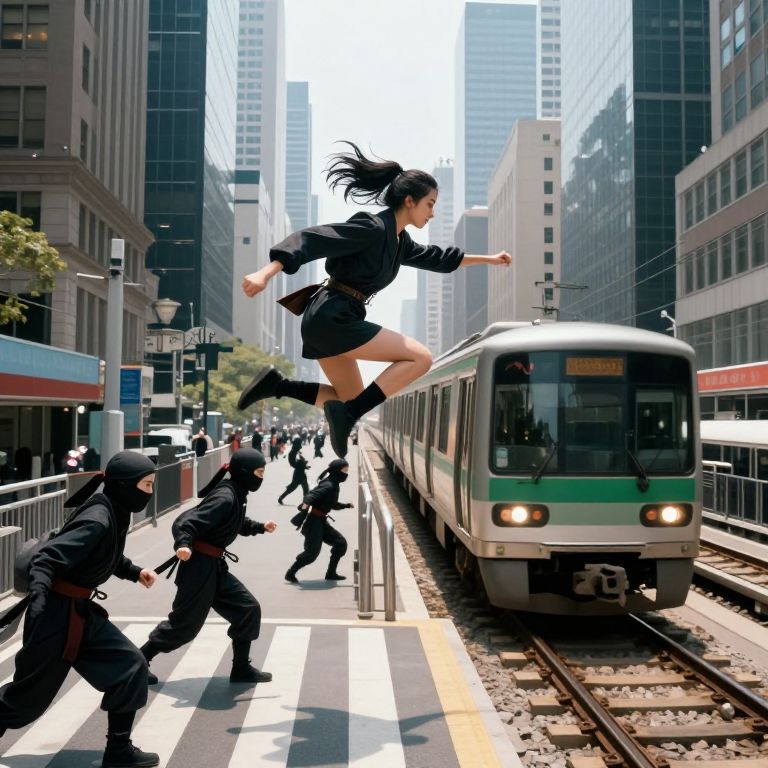 Dense urban development, tall buildings, cyberpunk city, a train rushing along the tracks, a pedestrian crossing not high above the train, a girl jumping from the pedestrian crossing onto the train, the girl is stylishly dressed, a very beautiful girl, the girl's black hair flutters upward, a girl in a ponytail on the train groups like a ninja, dynamic composition, sunny day