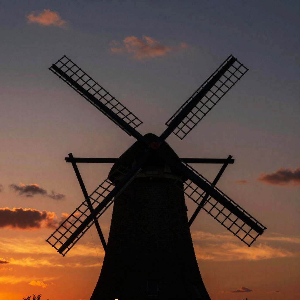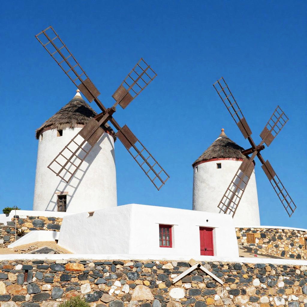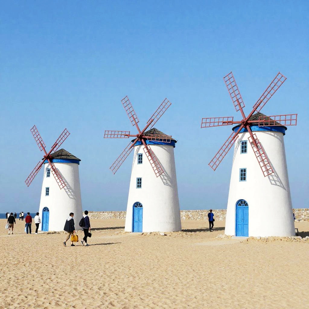 This is a bright, colorful photograph of a sunny beach scene featuring three white, round-roofed houses with red windmills and blue accents. The houses are set on a sandy area with a clear blue sky overhead. A few people are walking around, some carrying bags, and there's a stone wall in the background. The whole scene is vibrant and summery.