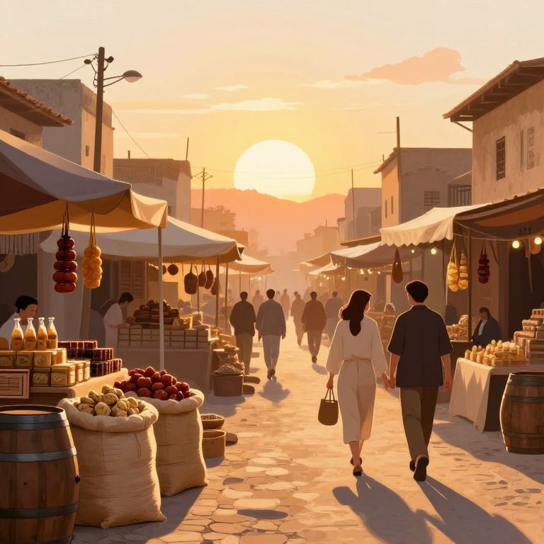 A digital illustration captures a serene nighttime marketplace bathed in warm, golden-hour lighting, where glowing lanterns and fireflies create a magical ambiance, and a solitary figure examines a bottle of light amidst the enchanting glow of lamps and the soft murmur of distant figures.