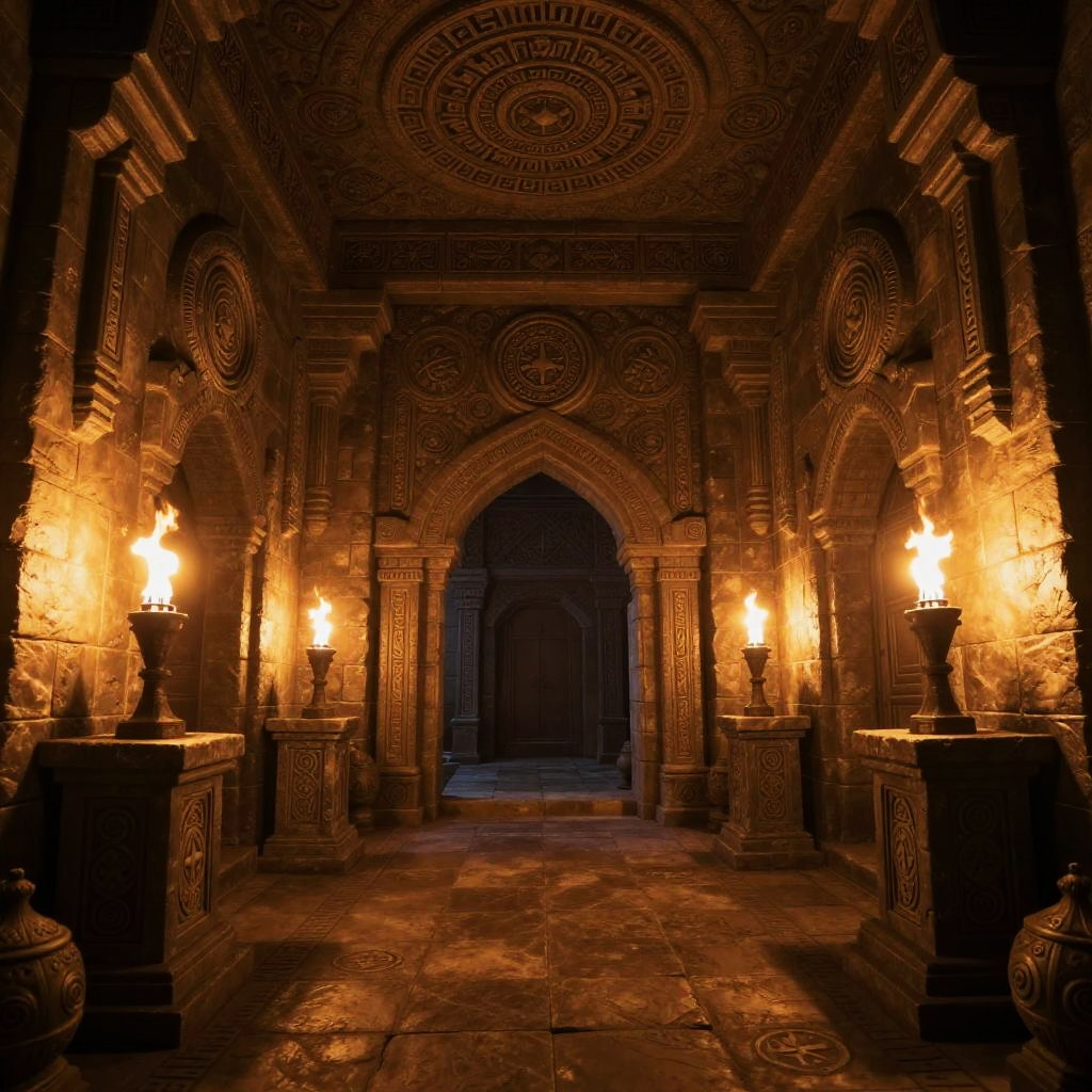 Dofus inspired ancient temple interior, decorated with ornate carvings and mystical symbols, warm torchlight illuminating stone walls, mysterious artifacts on pedestals, fantasy RPG dungeon vibe, rich textures and depth