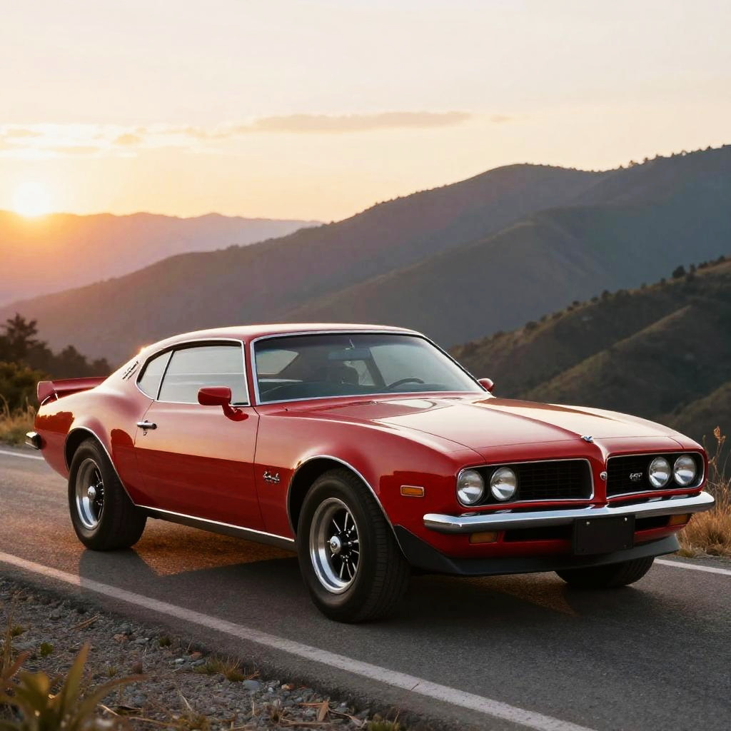 1986 red firebird parked on a scenic mountain road at sunset, vibrant red paint gleaming, classic muscle car design, sleek curves, detailed chrome accents, warm golden lighting