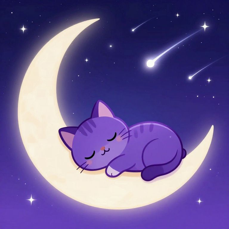 Sleeping cat cartoon on a crescent moon, night sky filled with twinkling stars and comets, dreamy and magical vibe, vibrant purples and blues, soft glowing effect around the cat, stylized with smooth curves and cute facial expressions, fantasy illustration style.