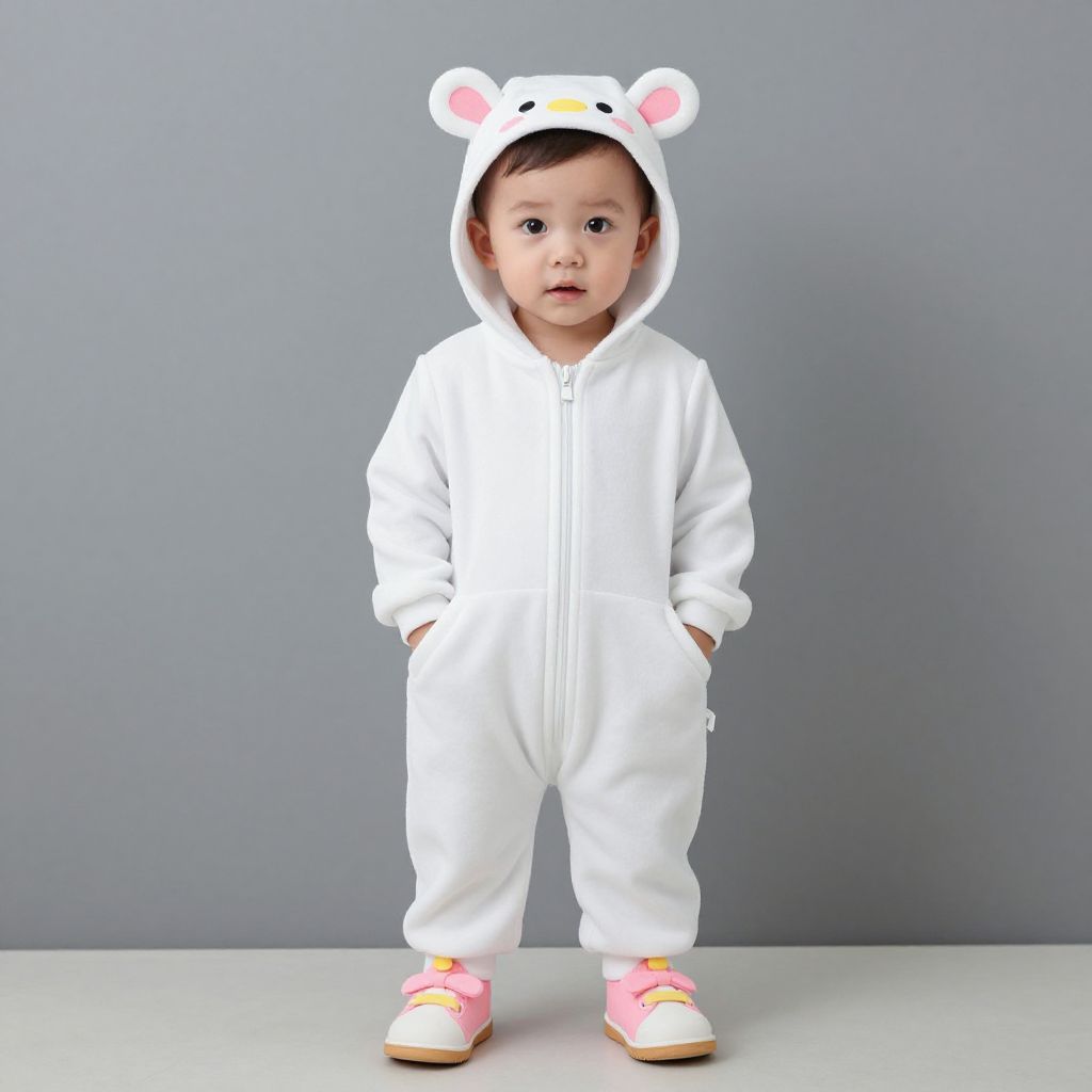 A baby is wearing a brown outfit with a blue overalls and a brown hoodie.