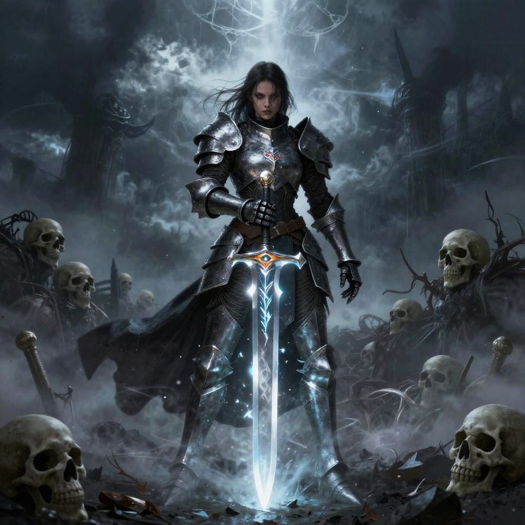 Female death knight clad in dark armor, wielding a glowing rune sword, surrounded by icy mist and shadowy skulls, standing on a battlefield under a stormy sky, digital art
