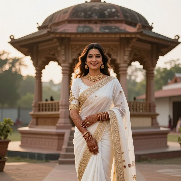 Photograph of a smiling Indian woman standing in front of an ornate, red-brick gazebo with a domed roof. She has long, wavy black hair, brown skin, and wears a white saree with gold borders and intricate embroidery, paired with gold bangles, a necklace, and earrings. Her makeup includes dark eyeliner and red lipstick. The background shows a blurred garden with trees and a white building with a red roof. The sun is setting, casting a warm glow over the scene. The woman's confident stance and traditional attire suggest a cultural or festive occasion.
