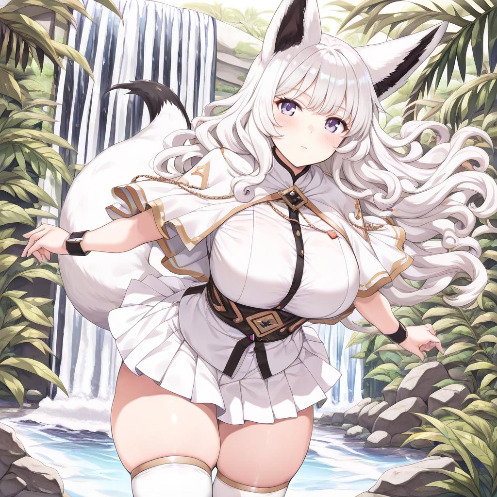(Masterpiece, Best Quality, Highres:1.4), Detailed, Intricate Details, 4K, 1Girl, Face Focus, Solo, (Black Eyes, Black Irises:1.2), White Hair, Long Hair, Floating Hair, Curled Hair, White Fox Ears, (Fox Tail:1.2), White Clothes, White Shirt, (White Skirt:1.2), White Thighhighs, White Capelet, Gold Trim, Jewelry, Large Breasts, (Skindentation:1.2), Nature, Jungle, Plants, Rocks, Waterfall