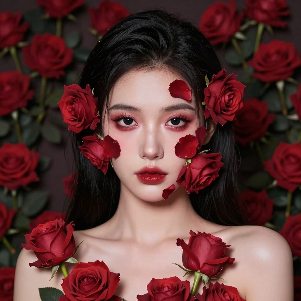 Photorealistic digital portrait of a young woman with fair skin, striking brown eyes, and long black hair, surrounded by vibrant red roses. She has bold red lipstick, and her expression is intense and captivating. The roses are densely packed around her, with some petals and leaves visible. The contrast between her pale skin and the bright red flowers creates a dramatic effect. The background is entirely filled with red roses, emphasizing her face as the focal point. The image has a high contrast and sharp detail, highlighting the woman's features and the texture of the roses.