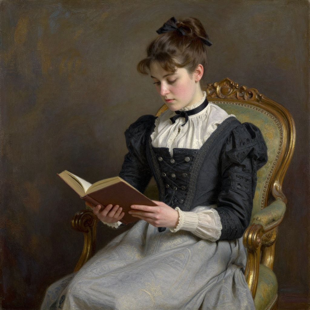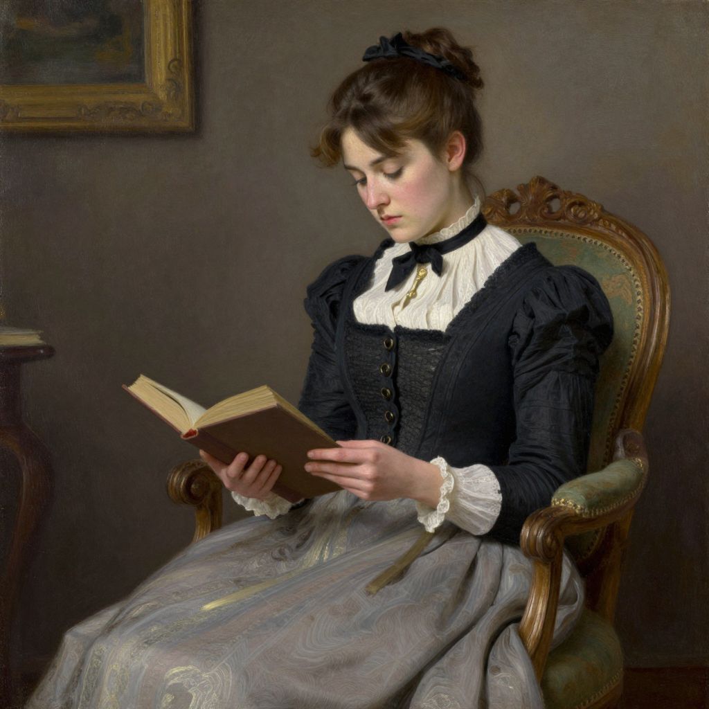 Photograph-style painting of a Victorian-era woman with dark hair in an updo, wearing a black dress and white ruffled blouse, reading a book