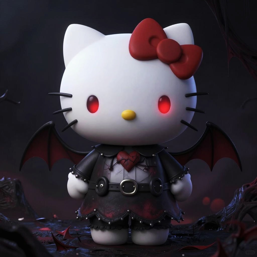 Hello Kitty evil, spooky kawaii character with demonic horns and evil grin, neon glowing eyes, dark mysterious forest backdrop, hyper-detailed anime style illustration