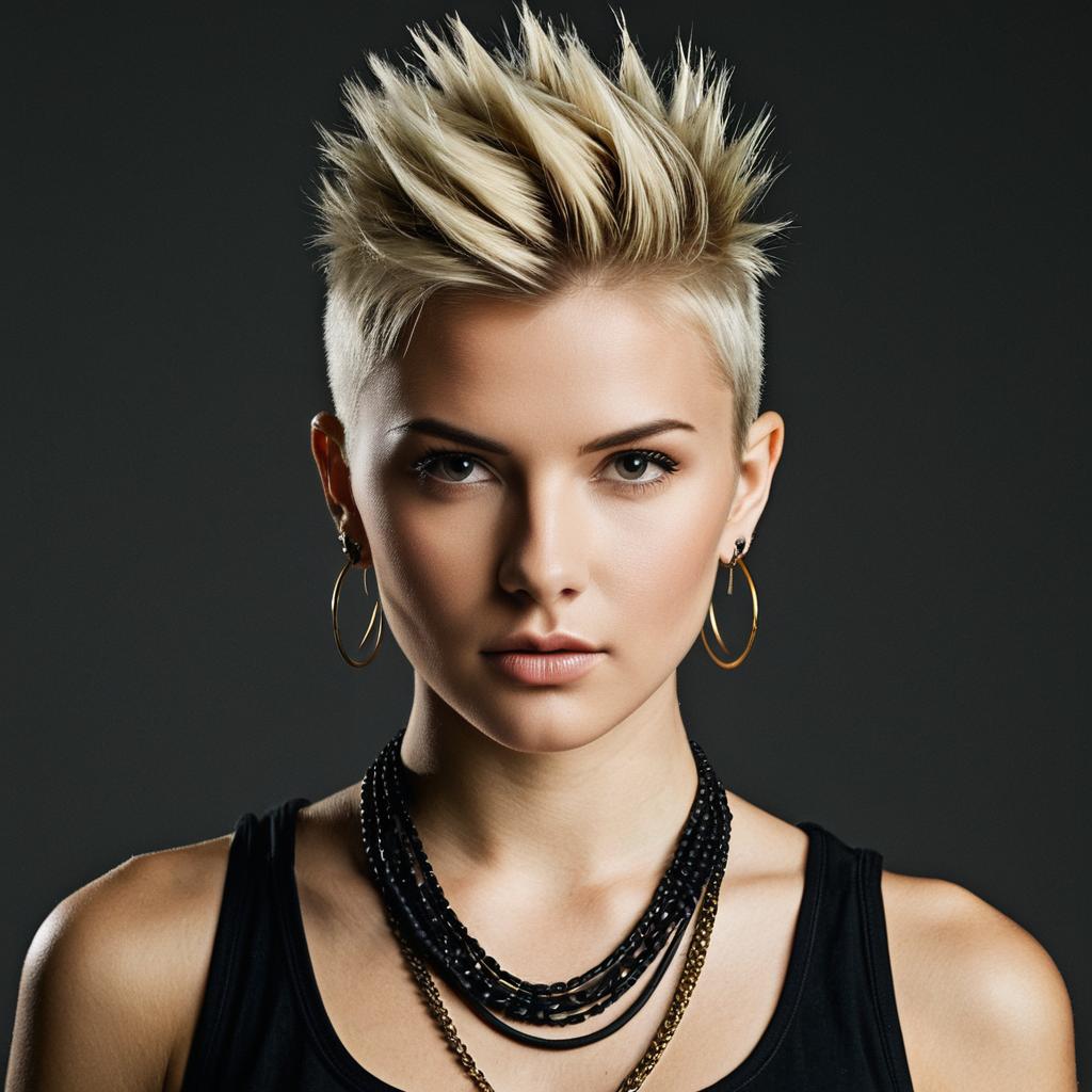 Short mohawk female, photorealistic portrait, young woman, short spiky blonde and brown hair, undercut, green eyes, fair skin, serious expression, black tank top, multiple necklaces, detailed earrings, gray background, studio lighting, high detail, modern fashion, punk style, realistic ure, high contrast, close-up, front view