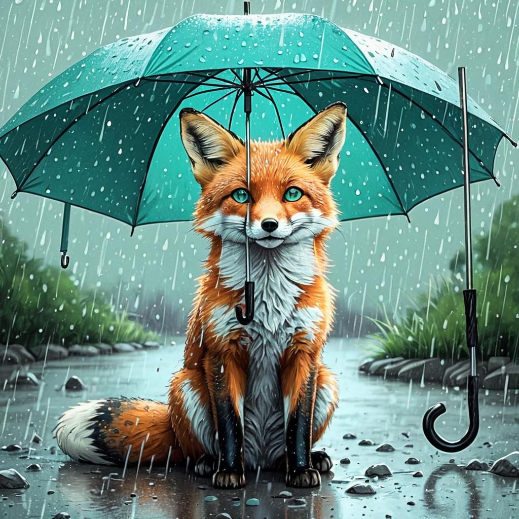 Whimsical illustration of a cheerful penguin sitting under a red umbrella, sheltering from the rain. The penguin has bright orange eyes and a joyful expression, adding charm to the scene. Rendered in a hand-drawn, cartoon style, with soft shading and a light background, the illustration captures a cozy and cheerful vibe, blending warmth with rainy day charm.