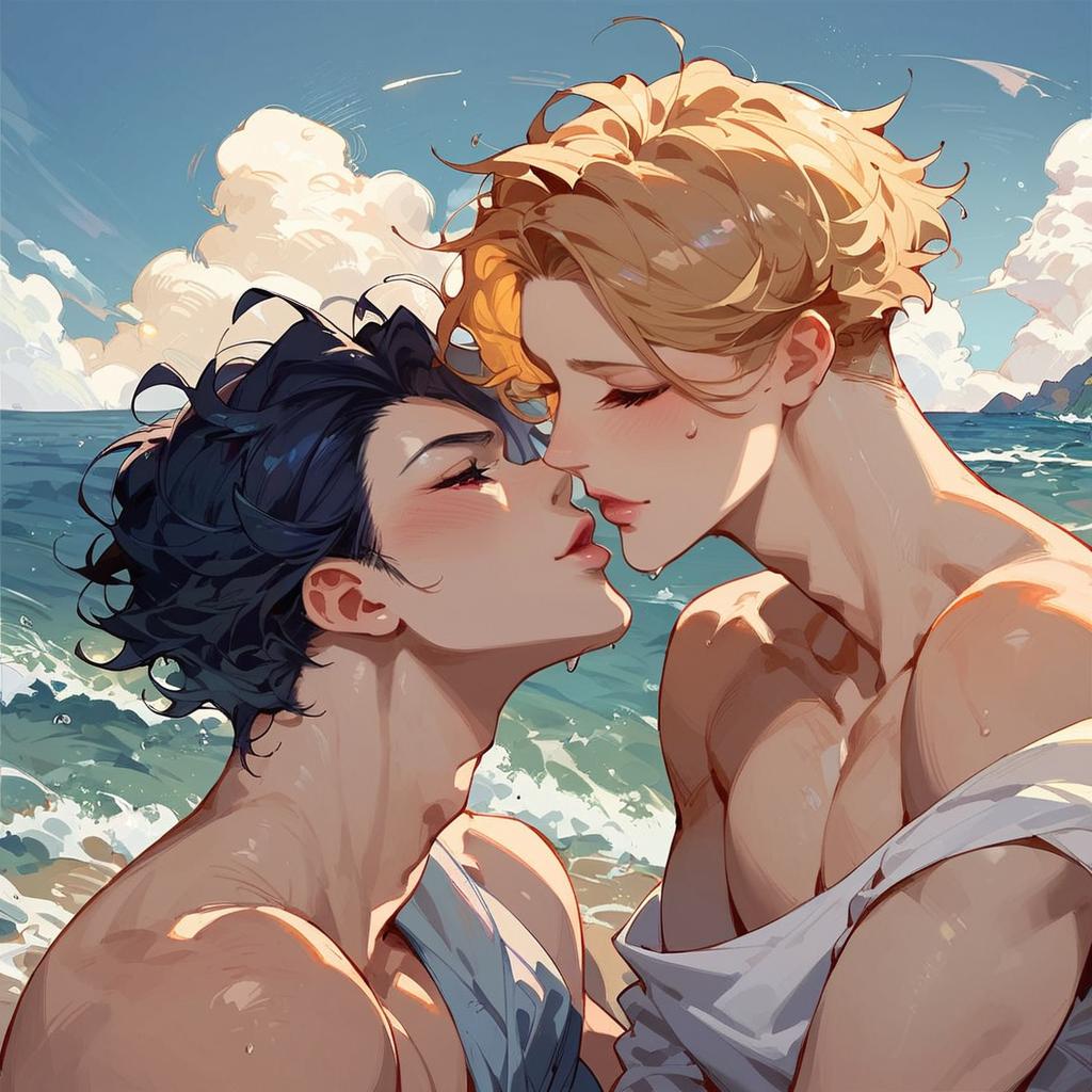 Score_9, score_8_up, score_7_up, a stunning sunset, ocean, multiple boys, sittings, island in the middle, waves