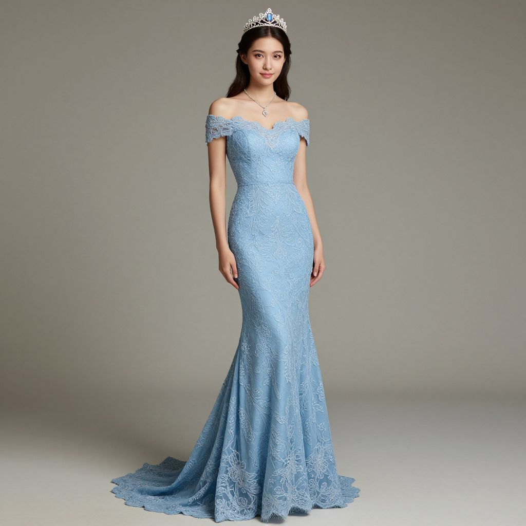 Elegant young woman wearing a sky blue evening dress with off-the-shoulder short sleeves, intricate lace appliqués, and a chapel train, accessorized with a sparkling tiara and necklace, exuding grace against a neutral backdrop.
