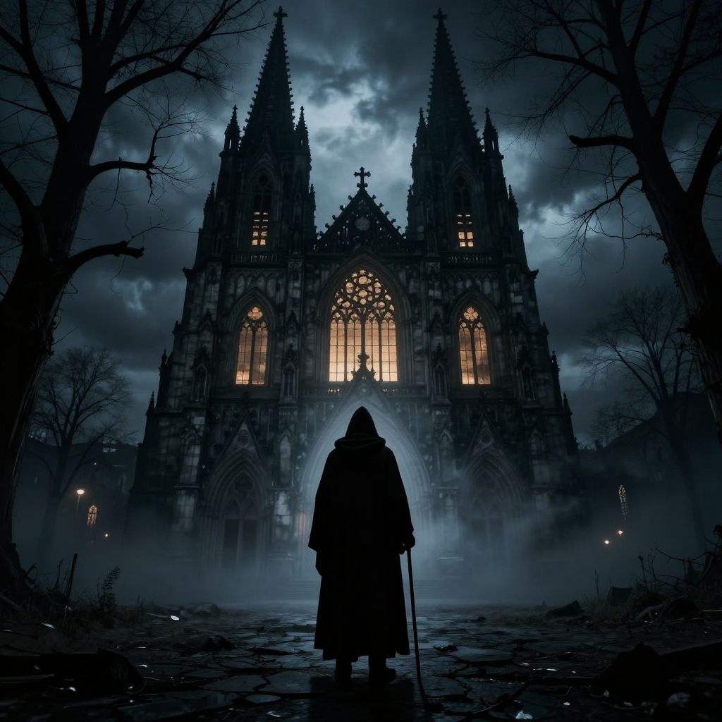 A dramatic dark gothic cathedral scene under a stormy sky with twisted, barren branches framing the image. A mysterious cloaked figure with a cane stands foregrounded, facing a glowing, ominous cathedral with illuminated windows. The atmosphere is eerie and foreboding, with mist and scattered debris on the cracked ground.
