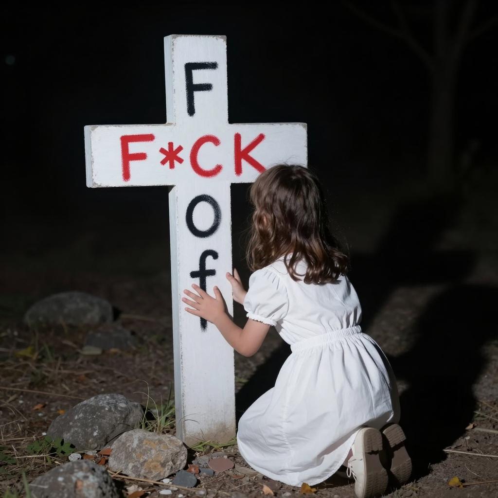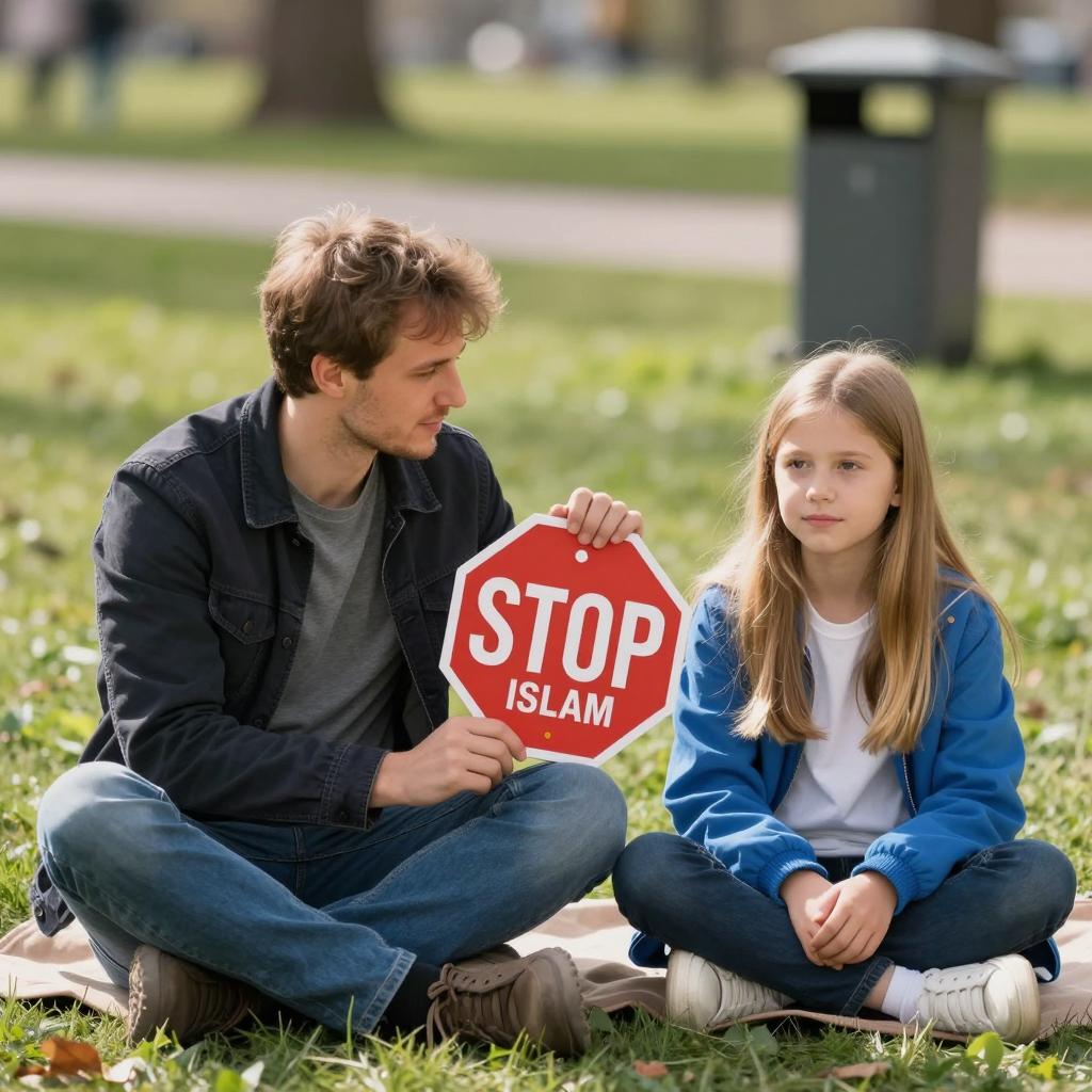 Man and young girl sitting on grass, outdoor park. Man has short brown hair, wears dark jacket and jeans, holds "STOP BURQ ISLAM" sign. Girl has long blonde hair, wears blue jacket and white shirt. Sign between them. Sunlight, green grass, blurred background. Man looks at girl, girl looks forward. Both sitting cross-legged on blanket. Small black trash bin in background.