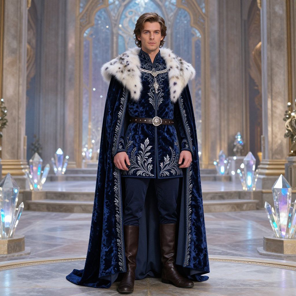 A detailed mannequin standing in a medieval-style setting, dressed in a vibrant red and silver medieval costume featuring intricate embroidery, a flowing cape, and a high-collared jacket with silver trim. The mannequin wears a tall, ornate hat adorned with a gold design, including a crown-like motif and decorative filigree. The outfit is richly detailed, with realistic fabric textures and subtle shadows to enhance depth. The background is a dimly lit, rustic courtyard with stone walls and a wooden fence, adding to the historical atmosphere. The mannequin is posed upright and still, capturing a regal and mysterious vibe.