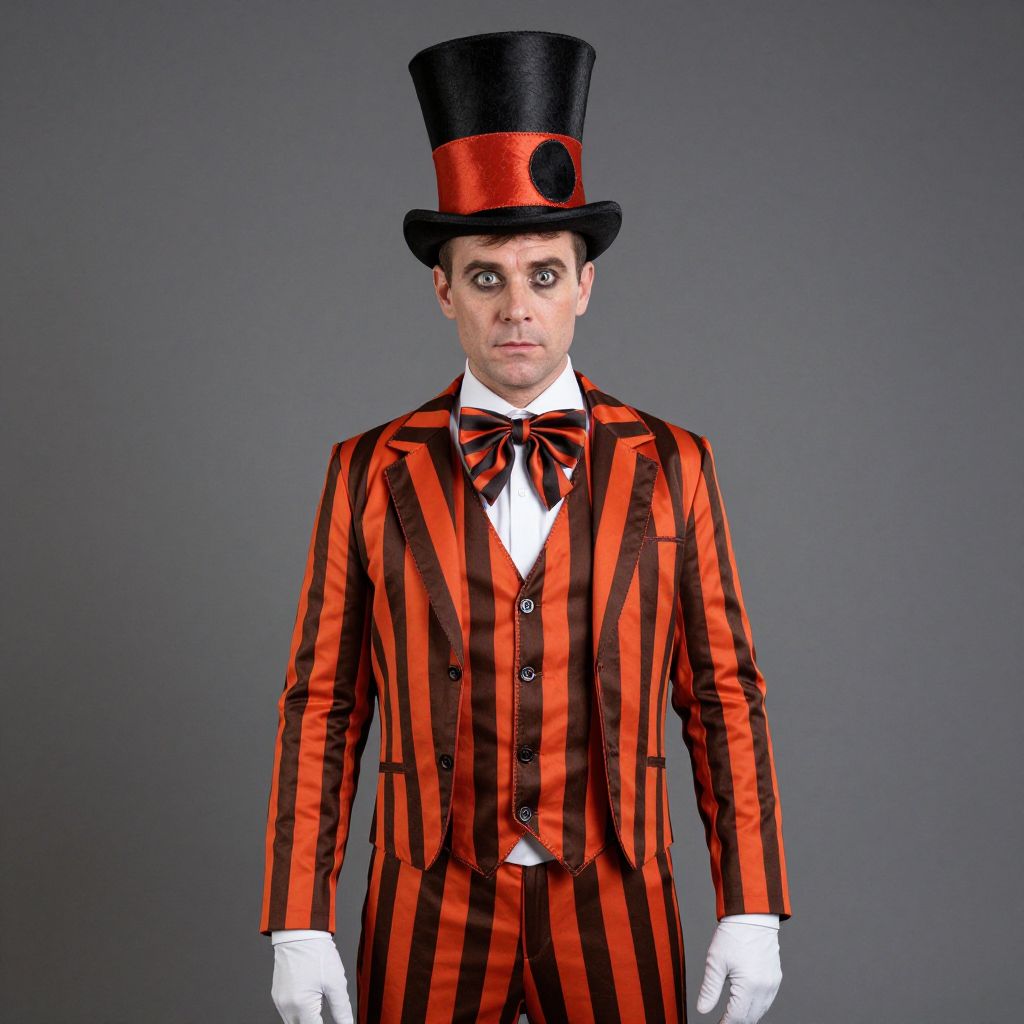 Mad Hatter Male Costume, man in a top hat and striped suit standing