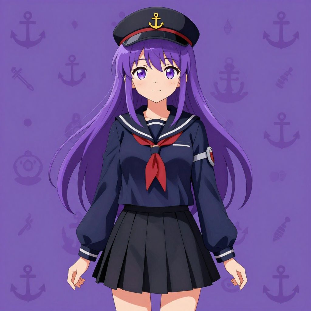 Anime style illustration of a young girl with long purple hair and purple eyes wearing a navy blue serafuku uniform with red neckerchief and an anchor symbol on the chest. She is also wearing a black flat cap with an anchor emblem and a black pleated skirt. The image features a patterned purple background with nautical-themed symbols.