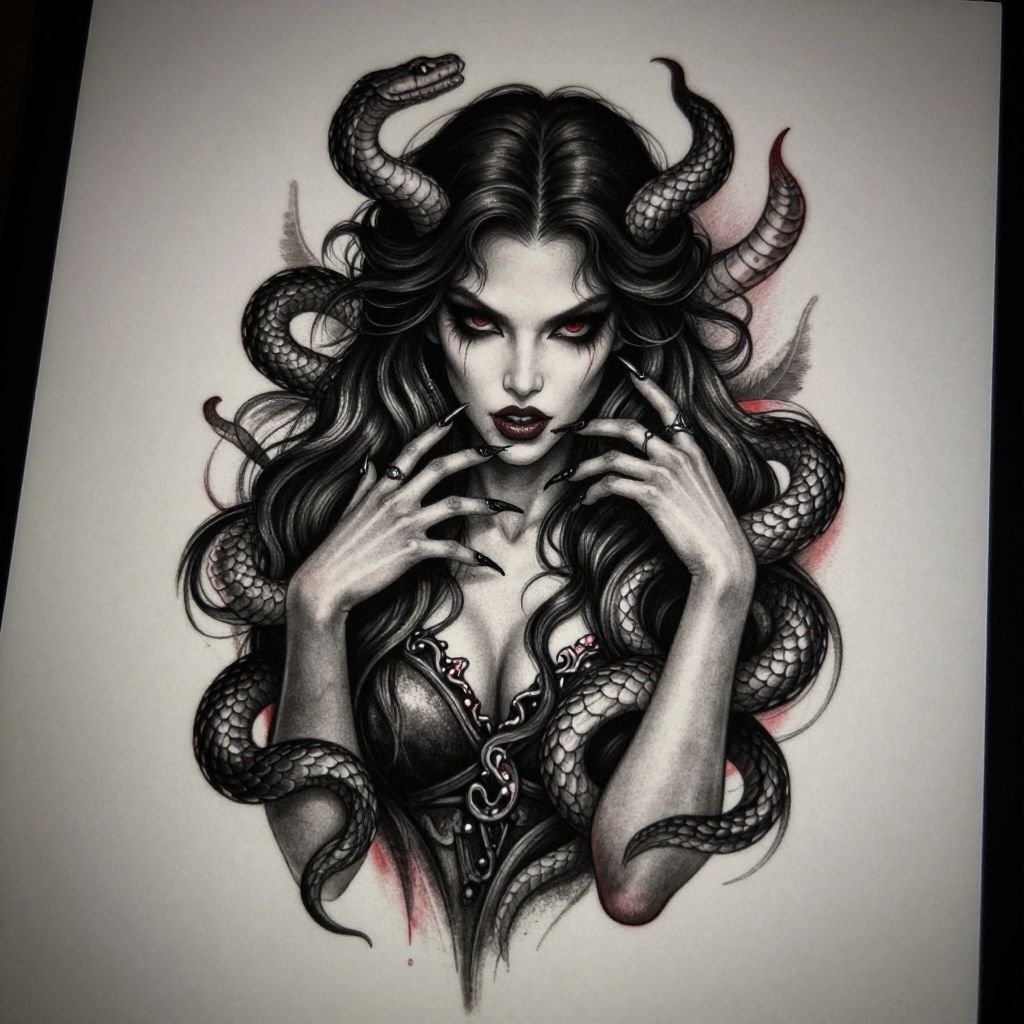 Dark tattoo concept of an evil woman, seductive and sinister expression, long flowing hair entwined with serpents, detailed scales and sharp nails, blend of realism and fantasy art, dark monochrome ink with hints of red highlights