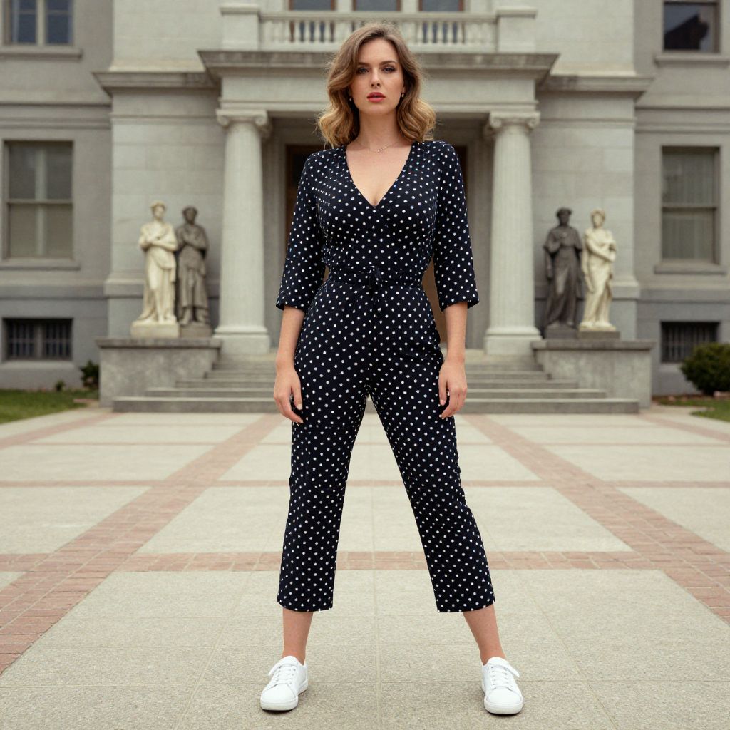 A woman, in a vintage-inspired polka dot jumpsuit with a v-neckline and three-quarter sleeves, cinched waist, and cropped straight-leg pants, paired with white casual sneakers, standing at a vintage courthouse plaza with historical statues, captured in the style of chromogenic film. Sexy. Pretty face and beаutiful eyes. Big breasts