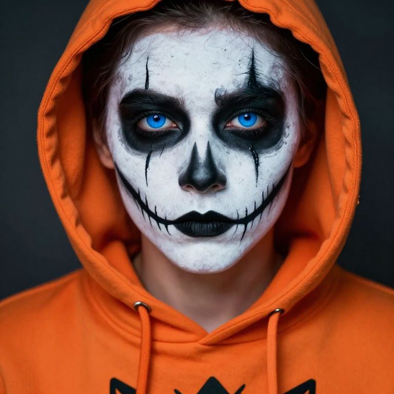 A close-up of a person's face with a Halloween-like appearance, featuring a white face adorned with intricate black lines outlining the eyes, nose, and cheeks, giving it a spooky, stylized look. The person wears an orange hooded sweatshirt with a black design on the front and a red lining on the left side, adding to the festive yet eerie atmosphere. The eyes are bright blue, contrasting sharply with the dark facial features, and there are thin black lines running along the top of the face, enhancing the eerie expression. The lighting is soft and slightly dramatic, casting subtle shadows that emphasize the detailed makeup and clothing texture. The overall mood is mysterious and festive, blending Halloween themes with a modern, slightly surreal aesthetic.